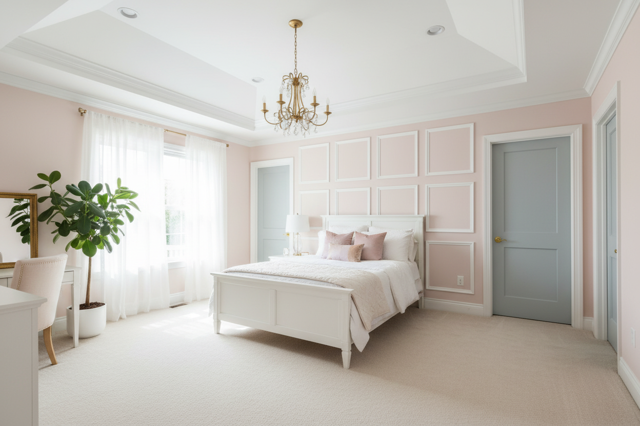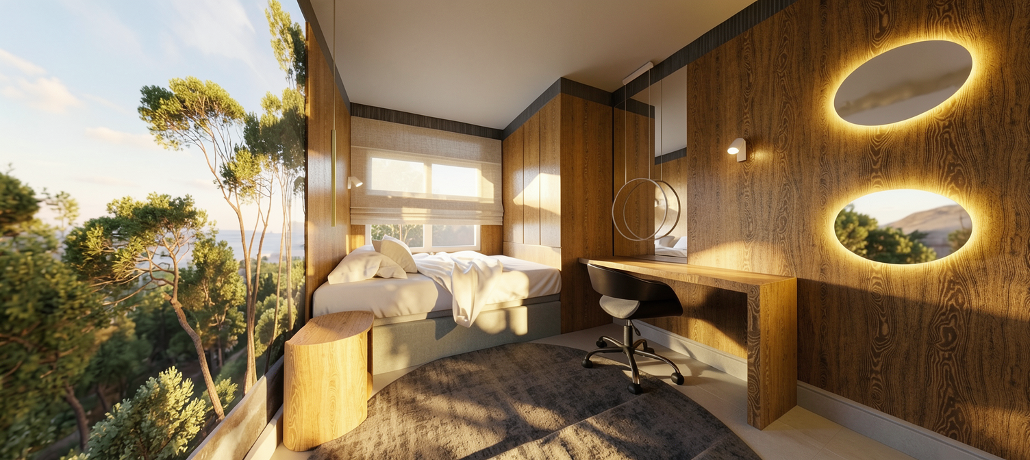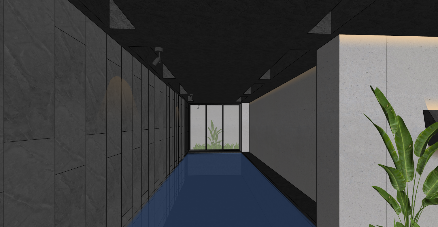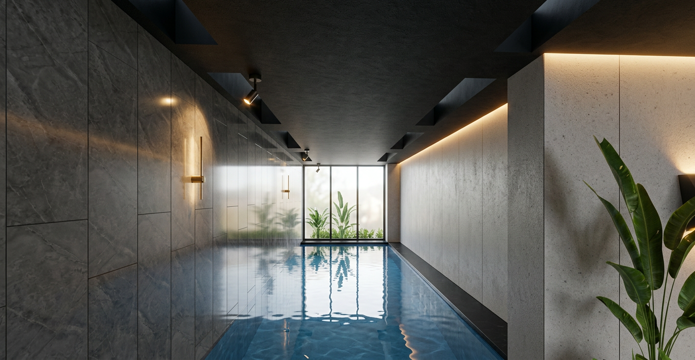render a modern indoor pool area with sleek dark gray concrete walls and a smooth black stone floor illuminate the scene with soft warm ambient lighting from elegant wall sconces depict a serene blue pool reflecting the light subtly surrounded by lush vibrant green plants in black planters capture a minimalistic and tranquil atmosphere highlighting the contrast between the dark tones and the greenery include gentle shadows and reflections to enhance the depth and realism there should be reflection