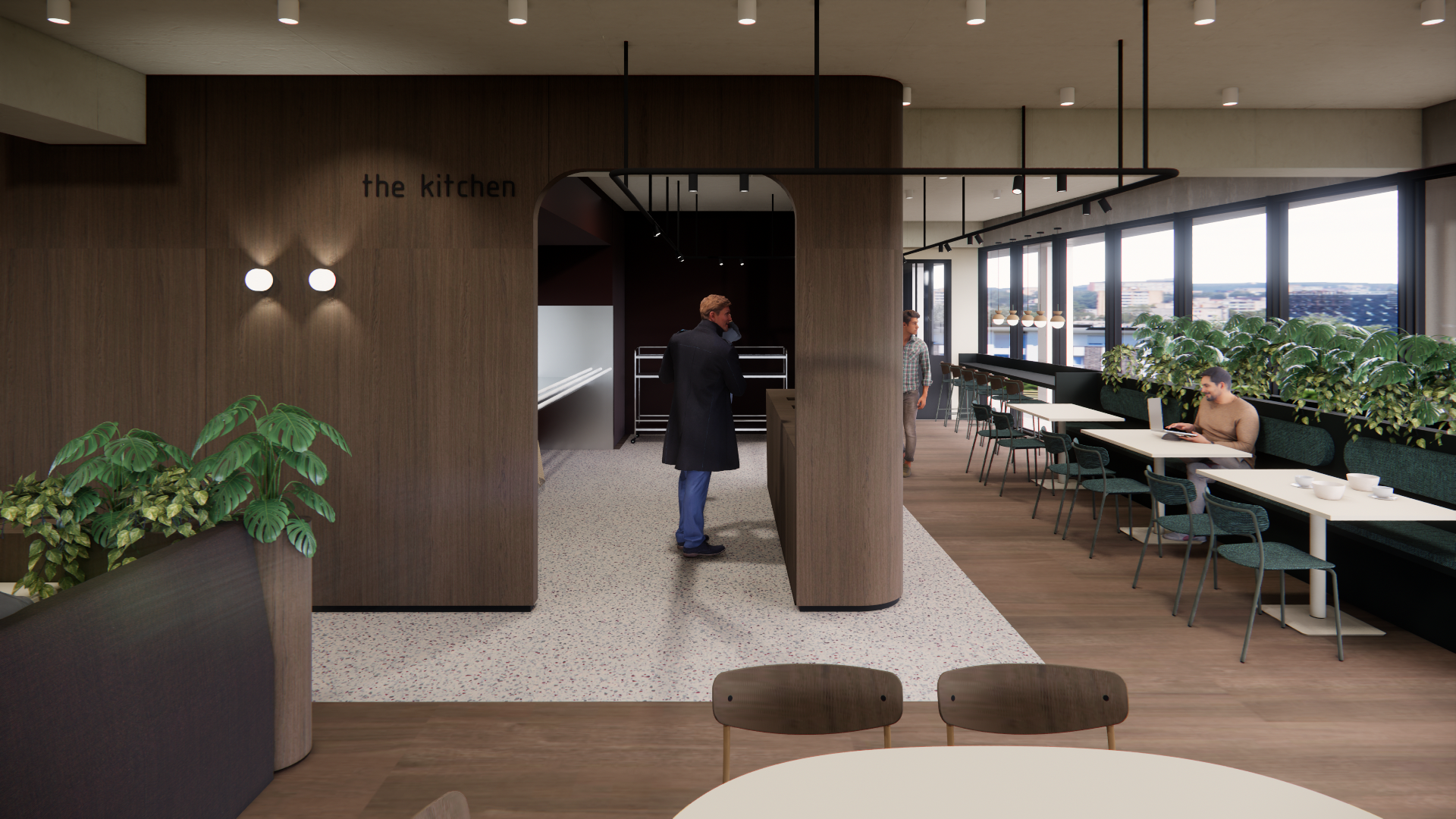 generate an image of a modern open space cafeteria featuring light beige spay acoustic ceilings include wooden floor with a natural mat oak finish design contemporary round tables in off white with stylish wooden chairs in a natural wood tone incorporate industrial style black light fixtures on the ceiling add large windows for natural light allowing a soft inviting ambiance the atmosphere should feel welcoming and vibrant