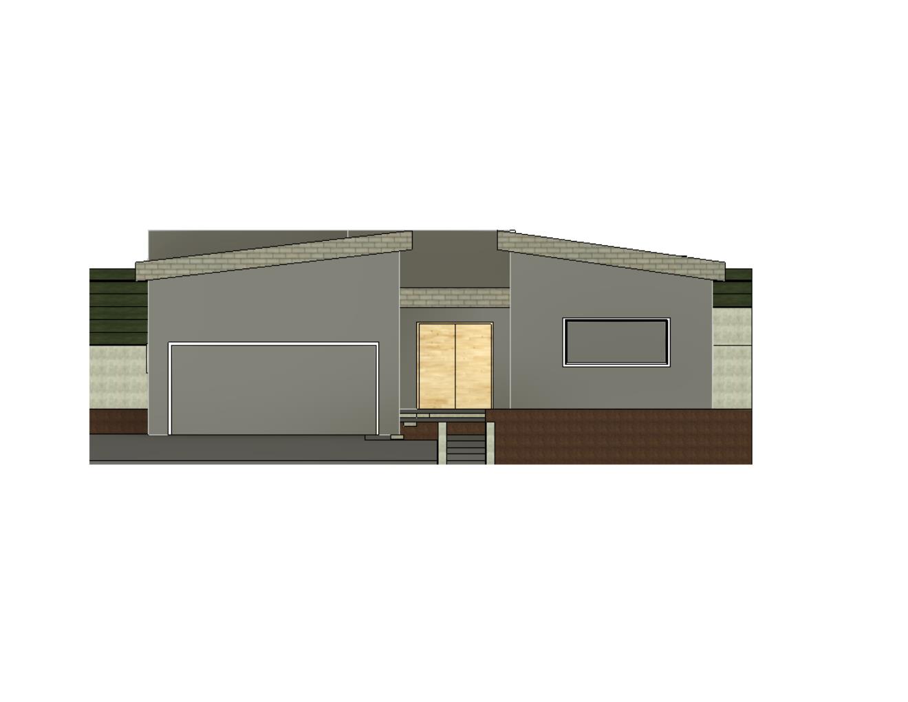 render an elevation of mid century home adding native californian planting landscape at the planter use black asphalt shingles as the roofing material make the walls off white stucco make the window frames white vinyl