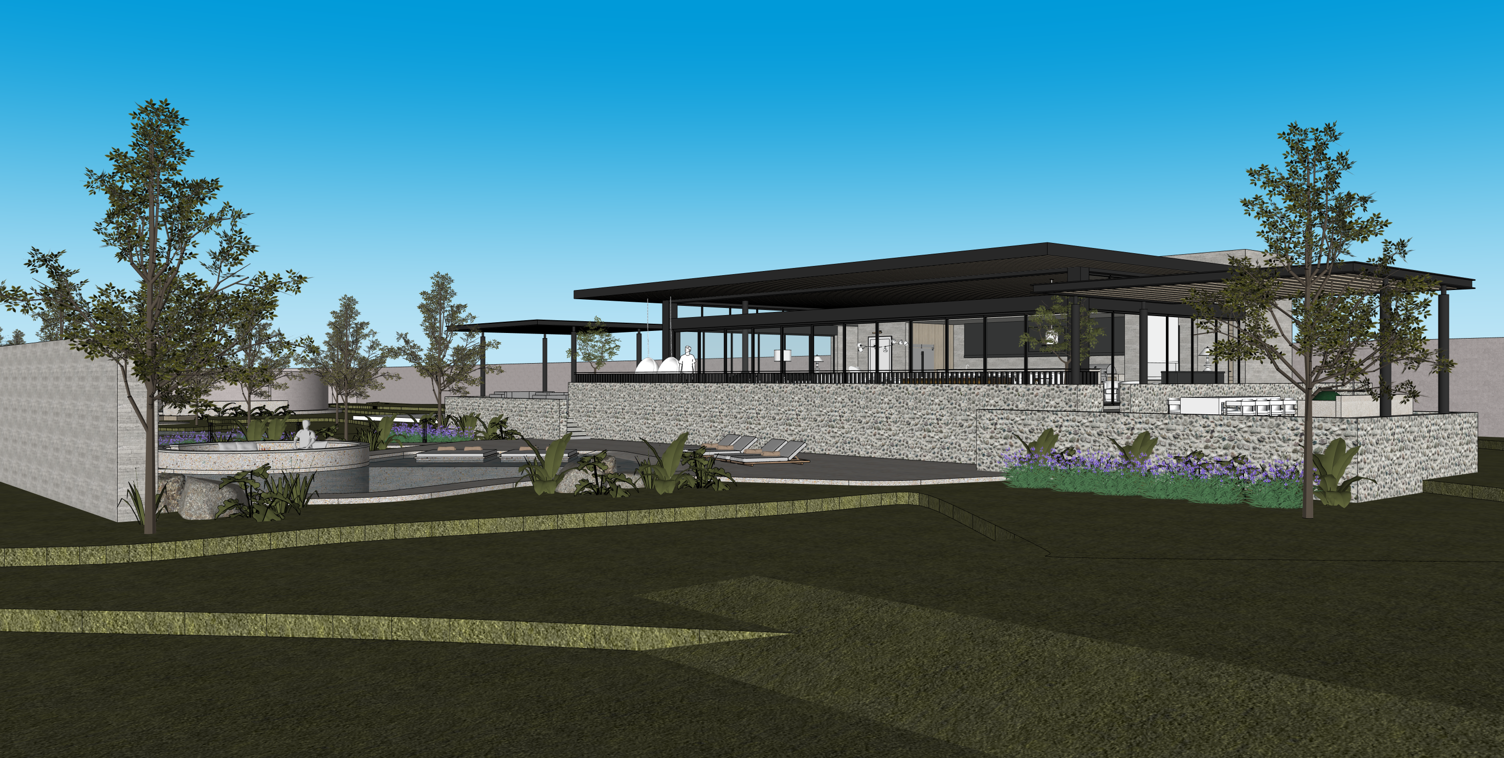 exterior shot render a modern architectural landscape featuring a sleek contemporary house with large glass windows and a flat roof the house is surrounded by neatly manicured grass with a lush deep green tone the walls are textured in light grey stone contrasting with the house s black structural elements there are tall elegant trees with dark green leaves scattered around add a striking water feature with clear sparkling water reflecting the bright blue sky above include flowering plants with soft purple blossoms at the edge of the scene create an atmosphere of calm and tranquility with soft natural lighting illuminating the scene