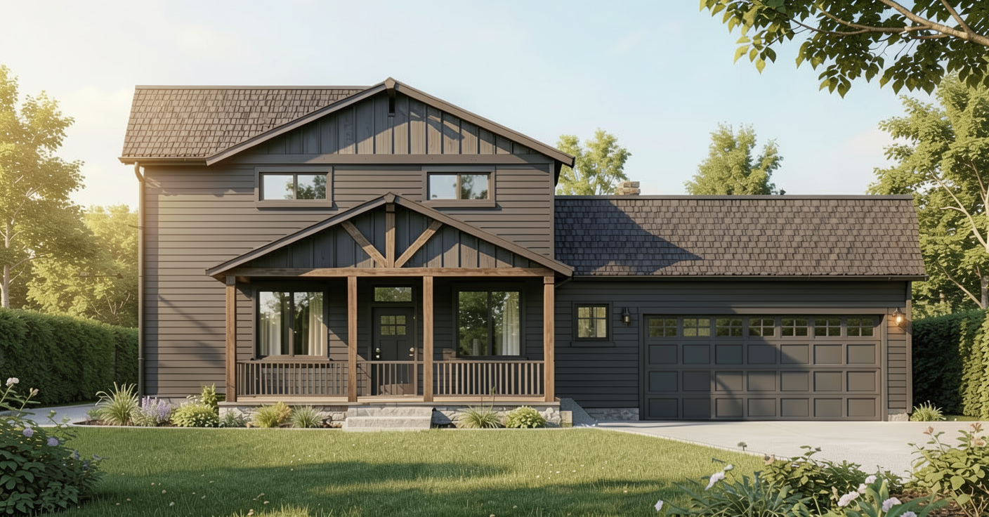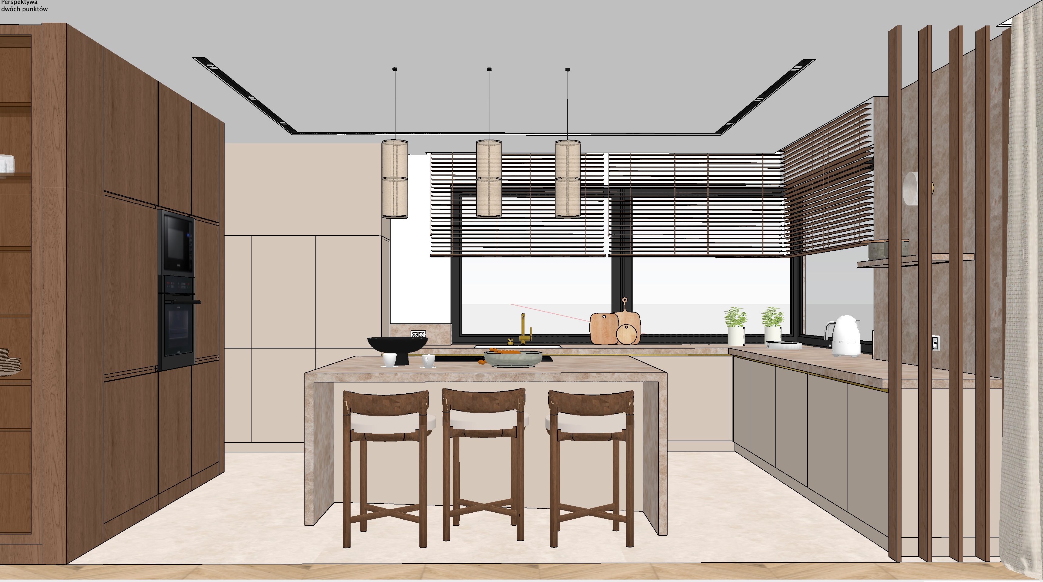 kitchen in beige color and walnut wood beige tiles on the floor and a garden outside the window