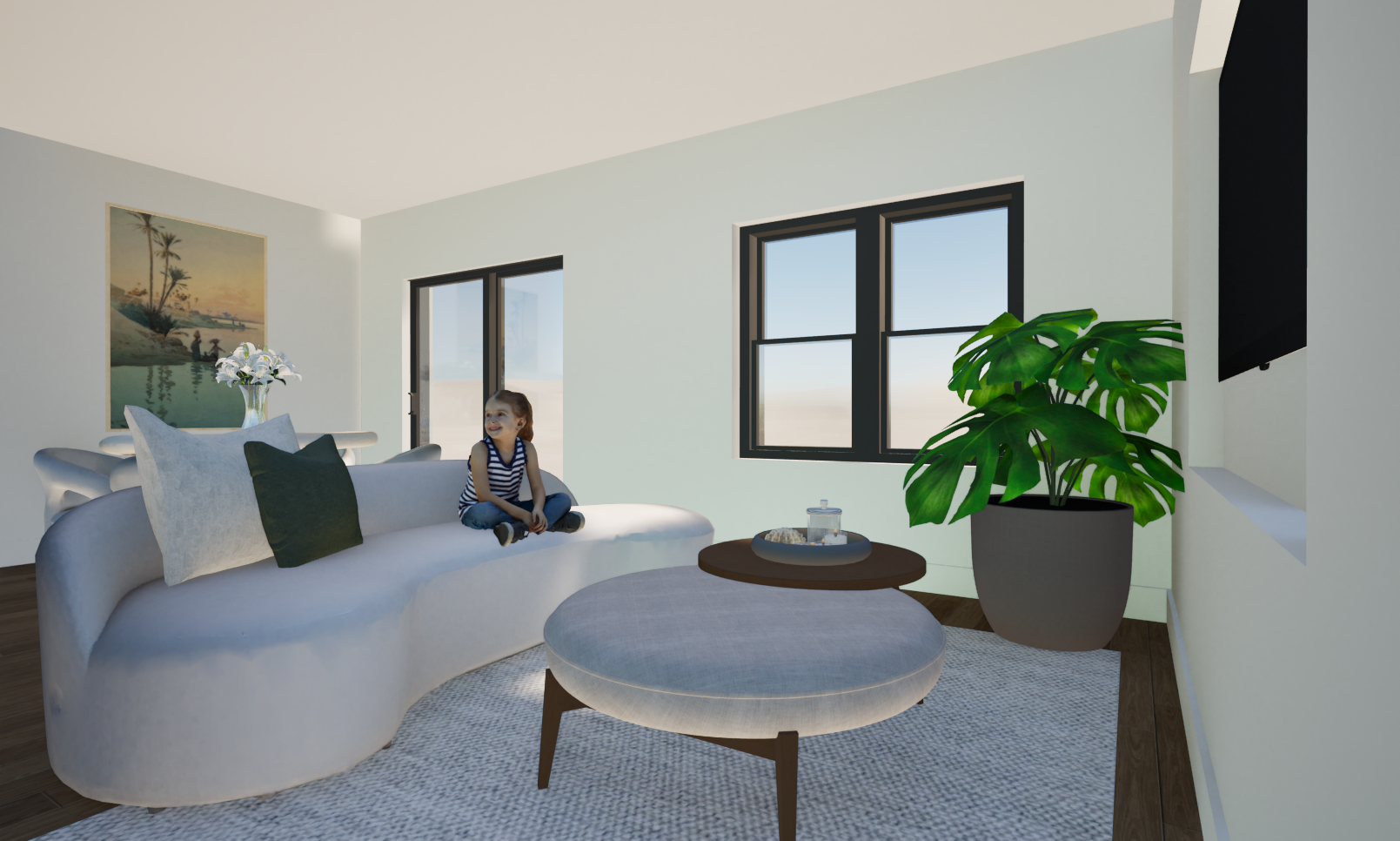 add subtle ceiling skirting cornices around the top of the walls and add a countryside view in the window and sliding door