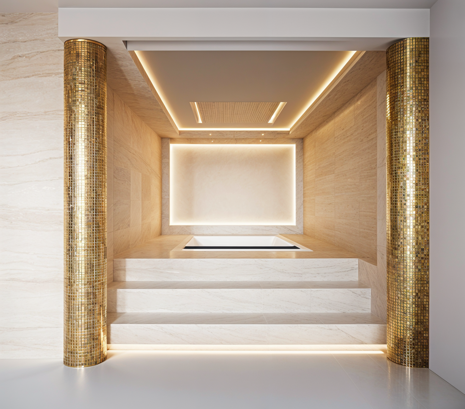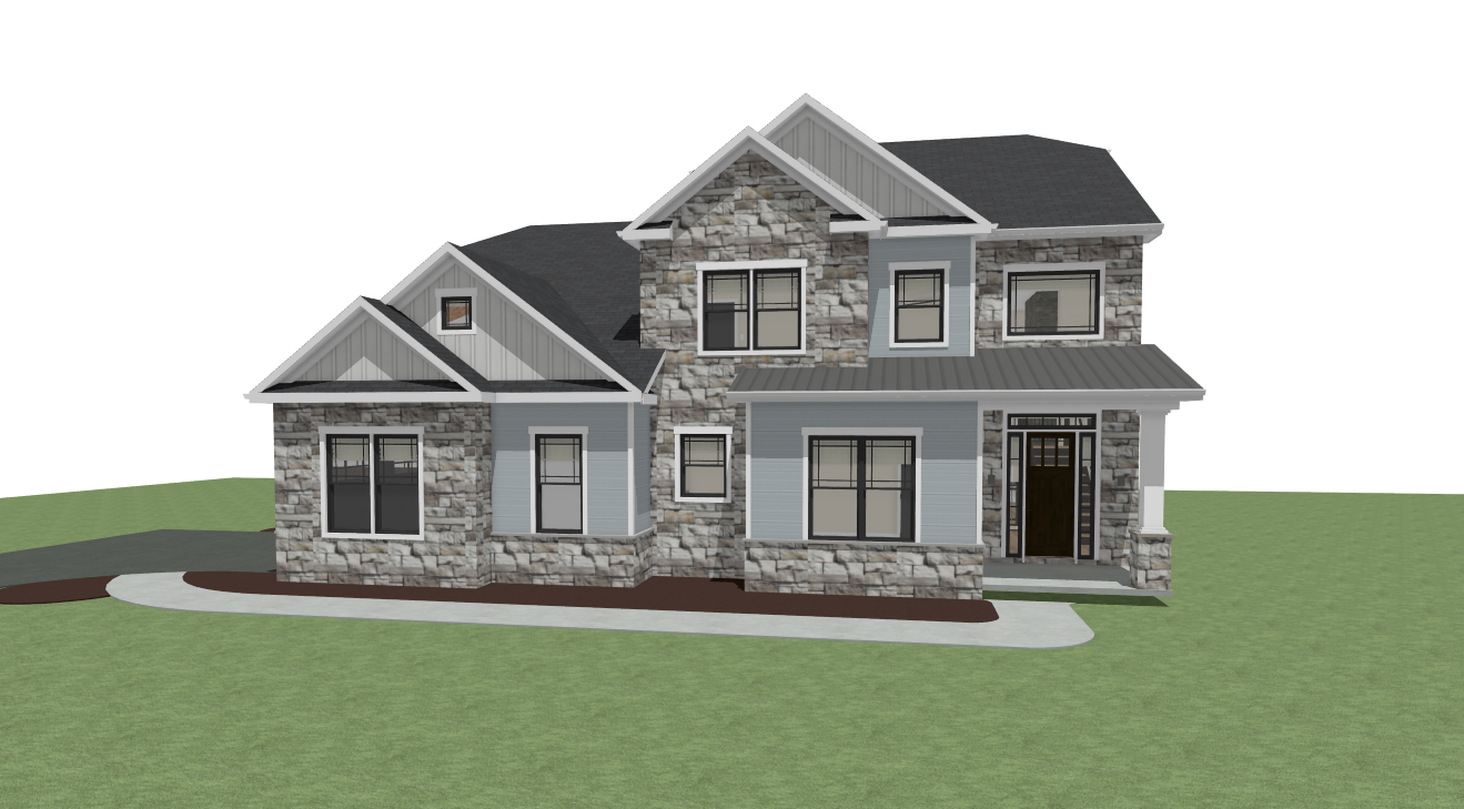 render this 3d image to appear photo realistic maintain all existing architectural materials and structural elements exactly as shown enhance the setting with a lush well maintained landscape include minimal beds manicured shrubs and a tree lined backdrop that frames the home naturally the windows should have a glossy finish with clear reflections of the surrounding trees and sky lighting should feel natural with soft shadows and realistic depth to bring the scene to life
