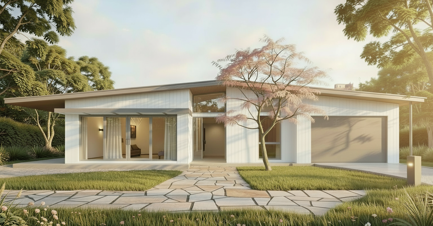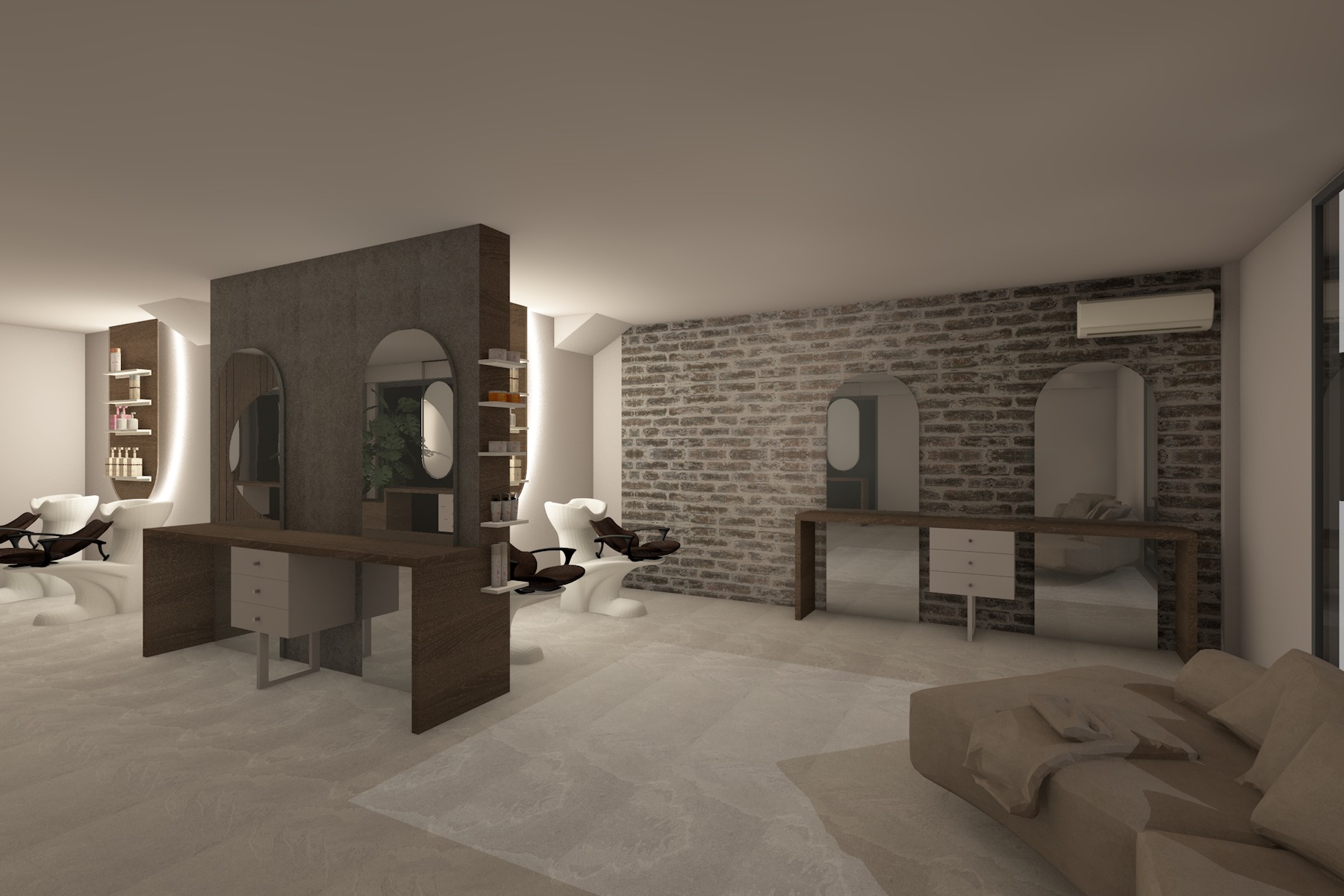a contemporary hair salon interior defined by a balance of raw textures and warm minimal elements the space is organized around a central structural volume clad in a dark textured material which anchors the layout and creates semi private styling zones hair stations are arranged both along the perimeter and around the central core each featuring elongated arched mirrors the mirrors are framed with slim matte black metal outlines adding definition and contrast against the softer surrounding materials integrated led backlighting enhancing depth and providing warm ambient illumination the mirror surfaces are intentionally diffused producing a soft blurred reflection that transforms them into artistic features rather than purely functional elements this approach reduces visual sharpness and contributes to a more relaxed calming user experience a combination of exposed brick walls and smooth neutral surfaces adds texture and visual interest while the light toned flooring keeps the space bright and cohesive warm wood elements in the counters introduce natural balance and continuity throughout the design soft indirect lighting clean lines and a restrained material palette create an atmosphere of calmness warmth and understated sophistication elevating the salon experience into a more serene and immersive environment fresh and inviting led light behind the four mirros