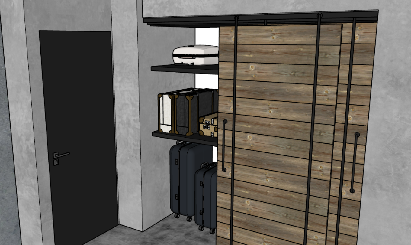 photorealistic render of a minimalist locker room with industrial pendant lights concrete and wood flooring matte black lockers and neutral walls keep the exact layout and materials add subtle ambient occlusion warm contrast and slight surface imperfections for realism no natural light please don t change the materials or layout or furnture or the design of the lights add some led lights on the back of each selve
