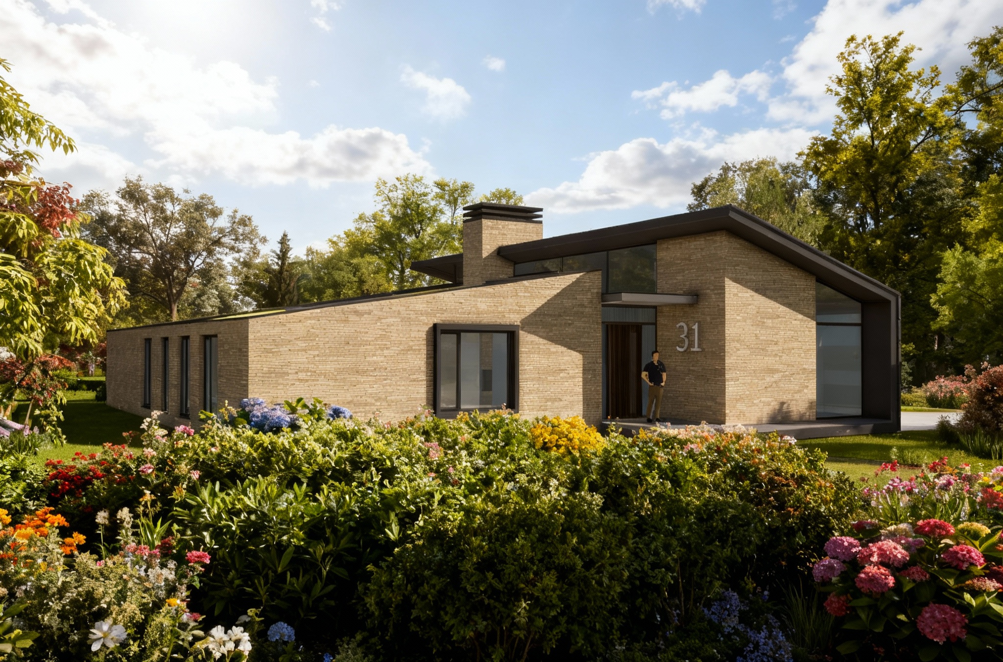 it is a part of a farm building in the countryside bushes and trees at the back of the buildings reflections in the windows clouds in the sky a beautiful sunny day make the stairs functional