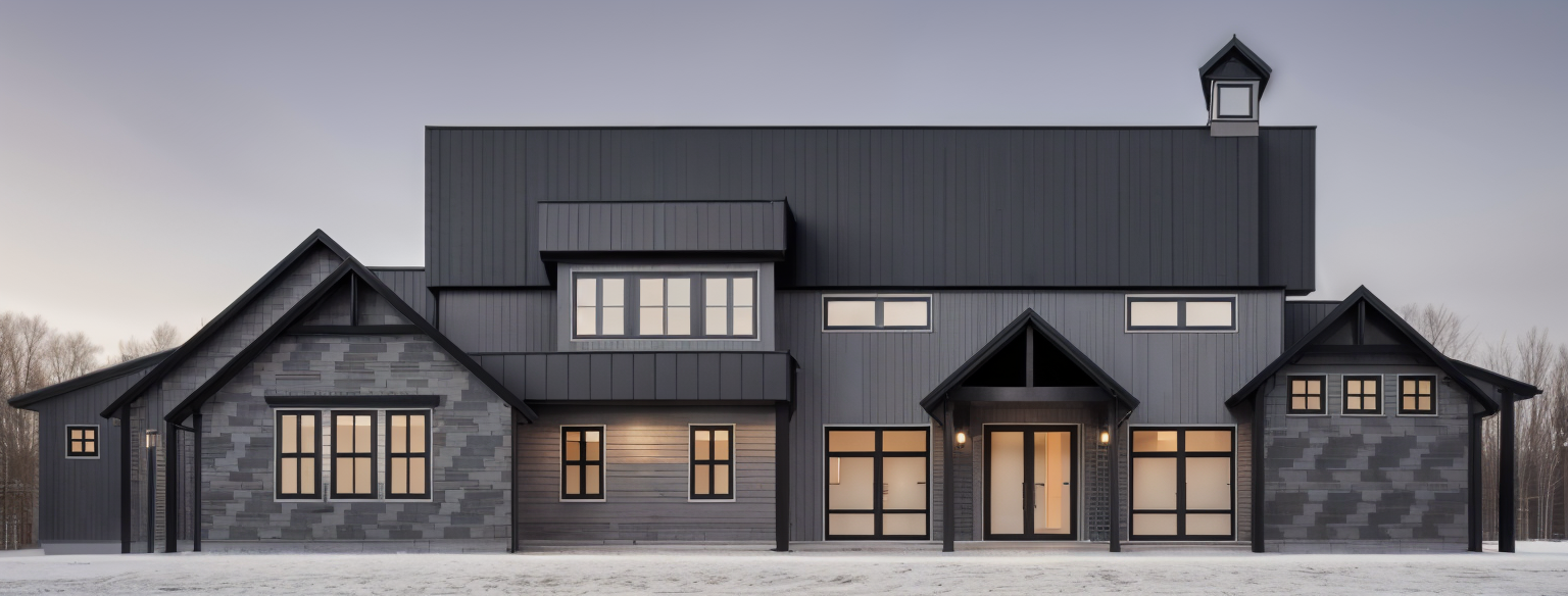 expessionism exterior shot black steel roof dark gray siding gray and white stone and medium brown wood accents architecture
