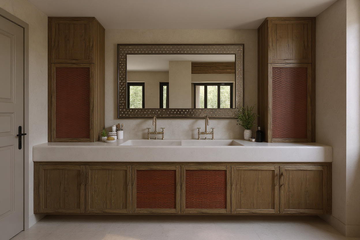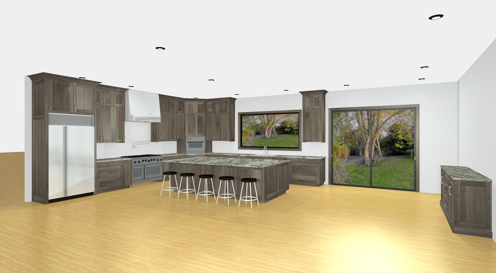 add a large rustic dinning table and chairs on the right side of the space 3 traditional pendants over the island commercial appliances undercabinet lighting view out the window and door are a covered patio black granite for the tops and backsplash stove hood is cultured stone leave the wall oven in the corner