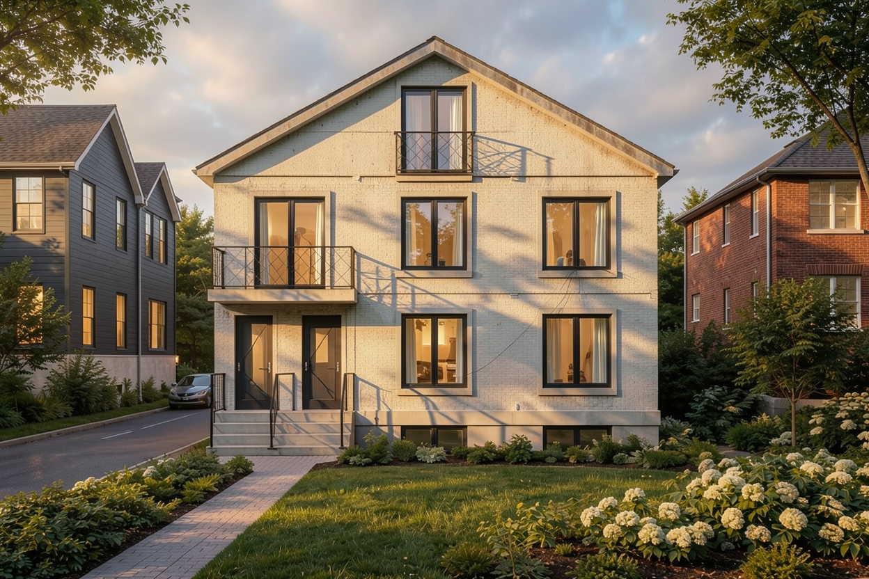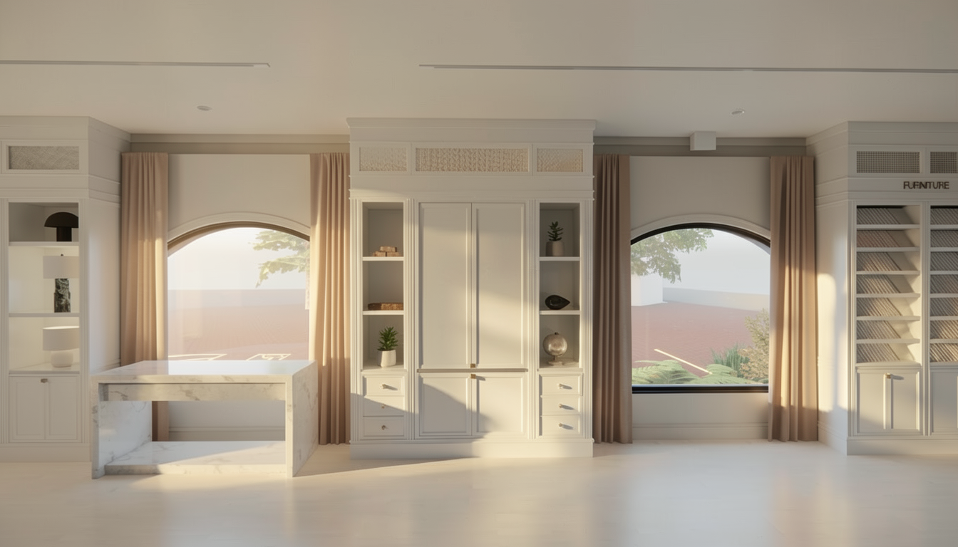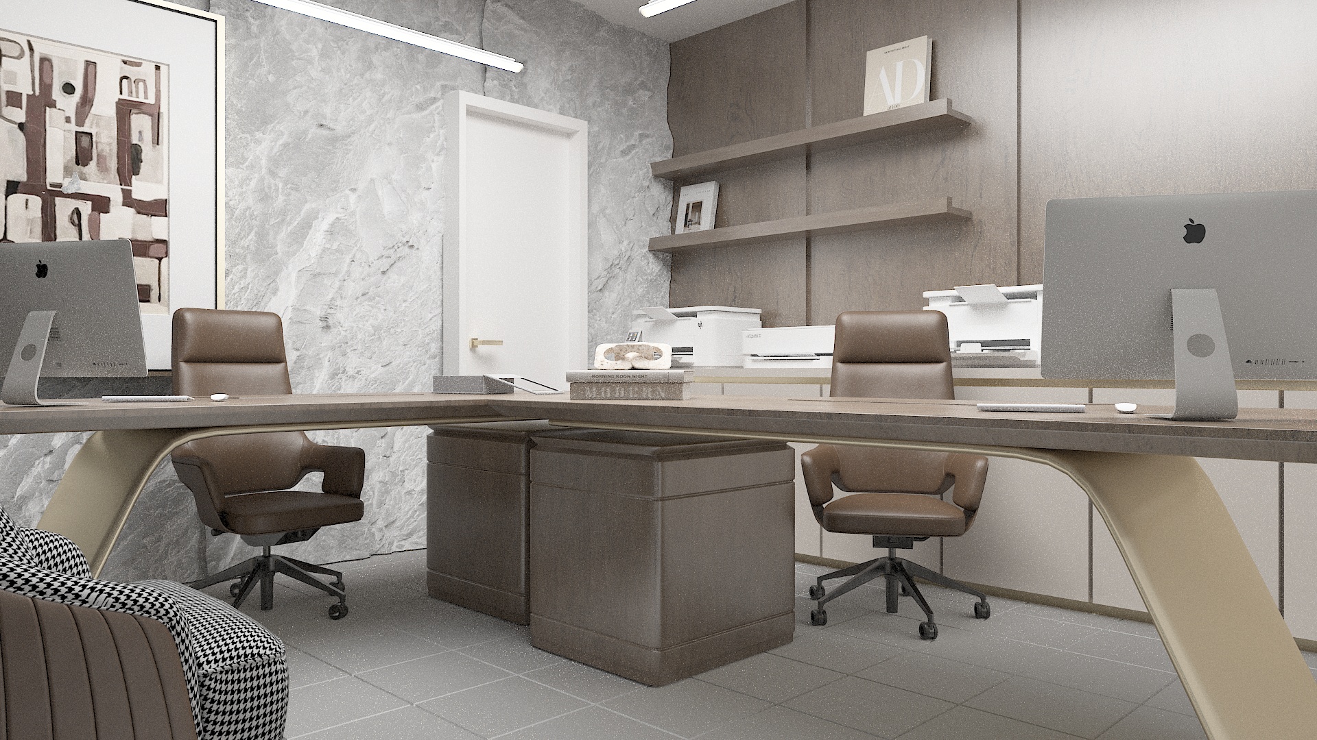 create hyper realistic rendering put all the wooden elements in the picture in an inconspicuous wood decor i want to achieve an elegant and sophisticated office look the rock on the wall should be realistic and the gold details sophisticated the leather material on the chairs is realistic and high quality realistic plant in a vase discreet light on wall lamps and linear pendants above the table golden hour ligtening soft shadows and realistic reflection do not change image and do not add new elements do not change colours and materials