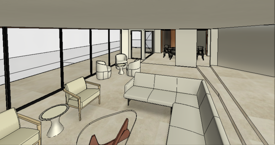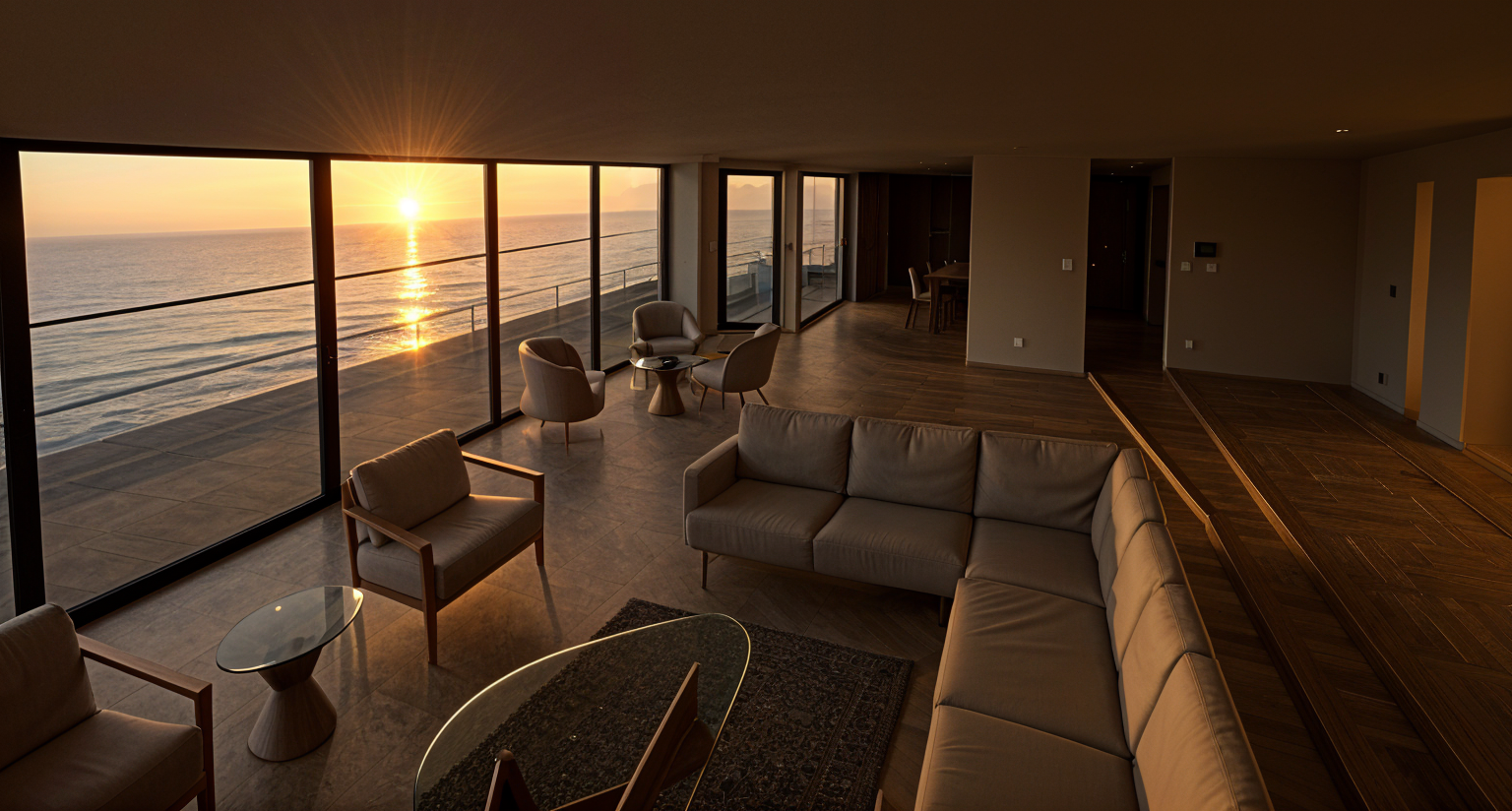 add a beautiful sunny day lighting ocean views in the glass windows to the left a glass railing outside add large area rug under sofa add limestone flooring keep steps intact