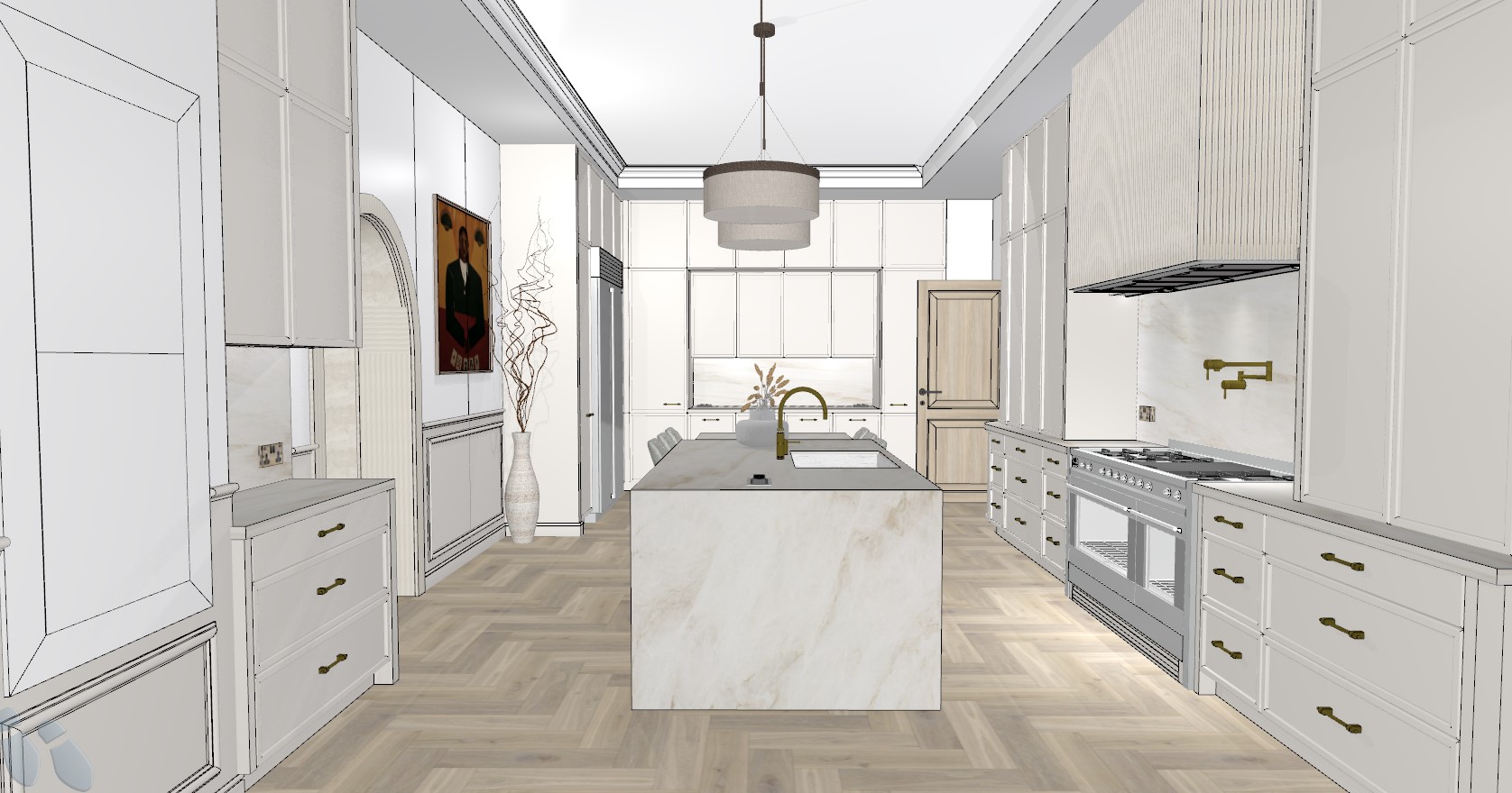 modern kitchen interior spacious and elegant featuring a marble island with soft beige veins cabinets are sleek white with subtle silver hardware the floor showcases a light oak herringbone pattern warm ambient lighting from a large fabric pendant lamp creates a cozy atmosphere walls and ceiling are soft ivory enhancing a sense of openness a delicate vase with dried twigs stands near a classic wooden door adding a rustic touch the atmosphere is inviting and sophisticated perfect for a luxurious modern home