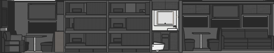 this is the side elvatiobn of the interior of a tour bus dark grey walls no handles on black wood cabinetry render nicely please