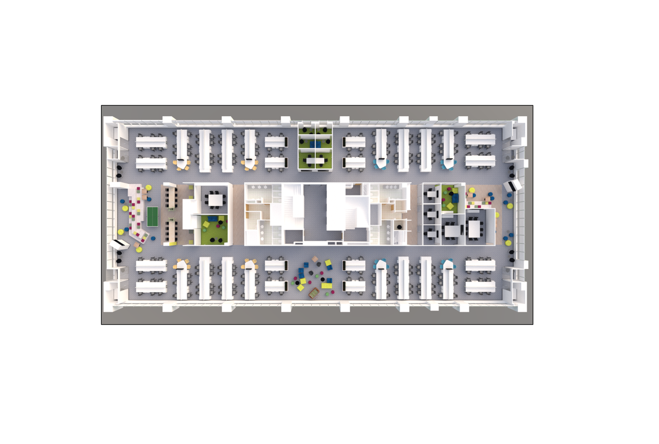interior from the top render this office floor plan exactly as shown in the image do not change the layout proportions furniture arrangement or color distribution convert it into a realistic top view render maintaining the same architecture and furniture zones design and materials 1 floors commercial vinyl or carpet tile in neutral gray tones for open office areas slight reflection but matte enough to feel realistic light beige tile in restrooms and cafeteria areas green carpet accent in collaboration pods 2 ceilings and walls smooth white walls with neutral lighting reflection drop ceiling panels in acoustic white 3 furniture workstations modern white desks with gray or black ergonomic chairs meeting rooms light wood conference tables with soft upholstered chairs gray or taupe lounge areas colorful poufs and sofas blue yellow green and red cafeteria area light wood tables white chairs and pendant lighting 4 partitions glazing glass partitions with aluminum frames for enclosed rooms frosted glass for private areas transparent for meeting rooms lighting ambience natural daylight from windows with soft shadows even overhead lighting to ensure visibility across the space warm neutral color temperature 4000 k bright professional yet comfortable office atmosphere rendering style realistic top down perspective axonometric camera not distorted high resolution clean contrast soft global illumination for depth professional visualization style suitable for presentation boards