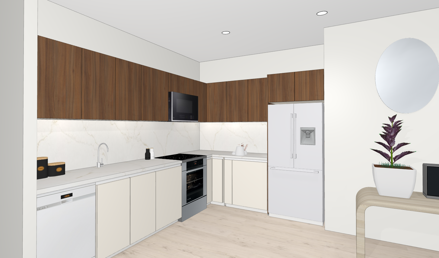 elegant kitchen walnut mat and magnolia gloss white fridge