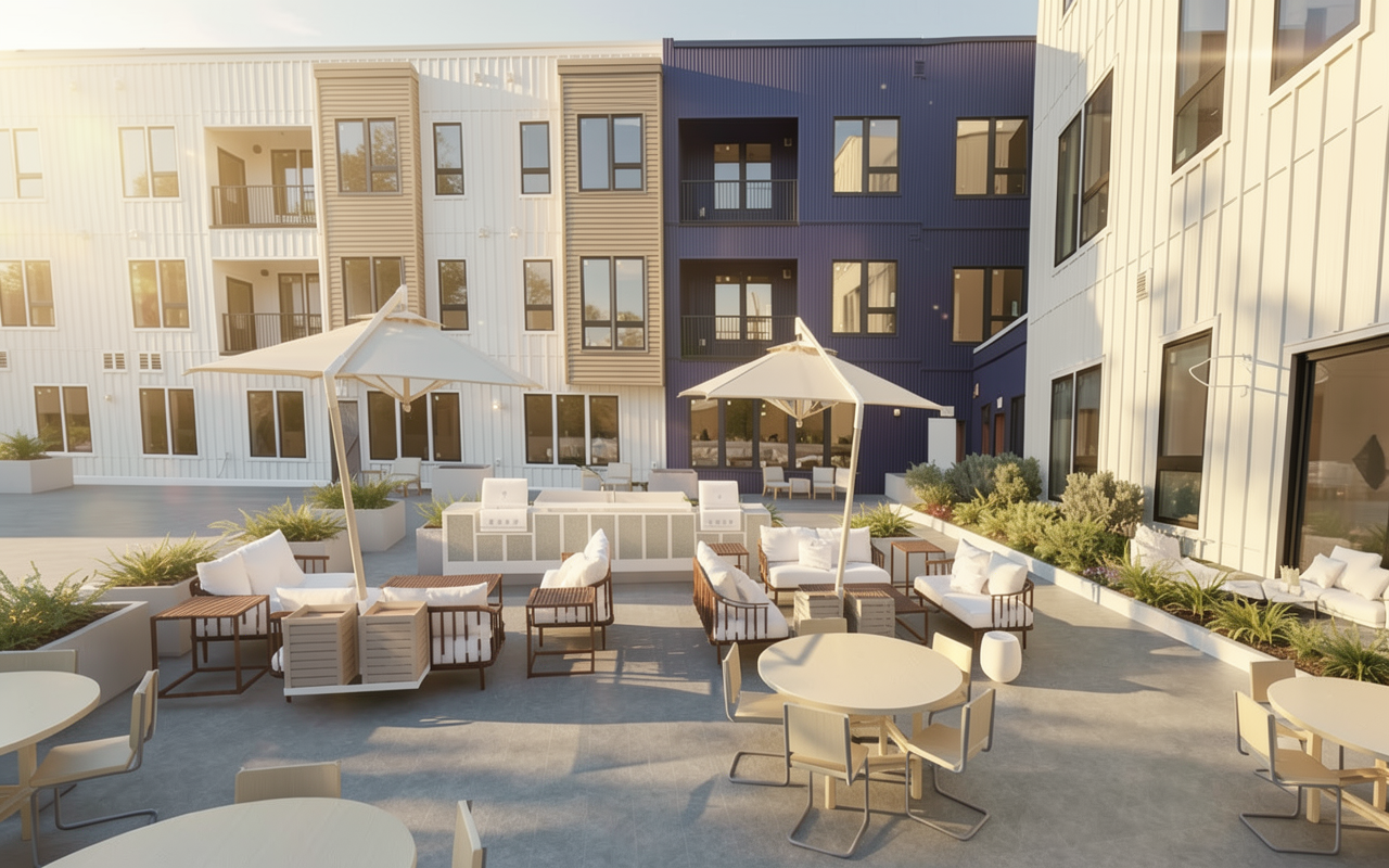 photo of a modern commercial building with a unique undulating facade featuring white concrete and large glass windows lush greenery adorns the rooftop and surrounding planters creating a blend of natural and built environments the scene captures late afternoon sunlight casting soft shadows that accentuate architectural details shot from a low angle on an ascending street emphasizing the building s height against a contrasting dark background with a wide angle lens effect to enhance perspective nearby structures include minimalistic residential buildings integrating seamlessly into the urban landscape add blue sky with few white clouds golden hour