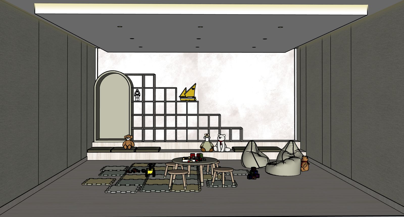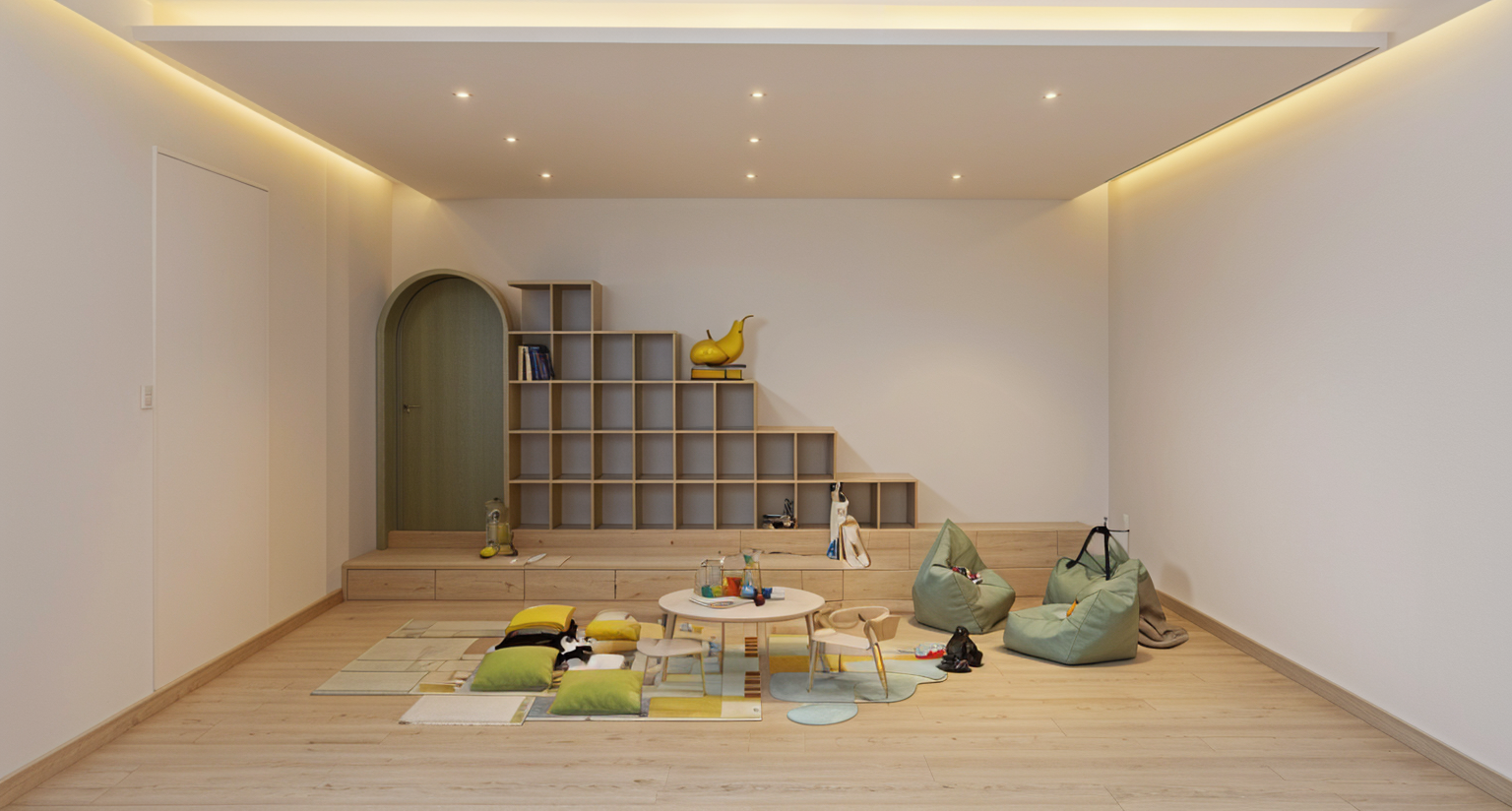 children s playroom with modern minimalist design a cozy atmosphere with muted warm colors soft graeen walls and white ceiling white shelving forming a stepped pattern neutral toned beanbags in beige a wooden circular table surrounded by small wooden stools on a puzzle mat in shades of gray olive and tan accentuate with a teddy bear plush toys in soft pastels and a bright yellow toy sailboat on the shelf indirect lighting casts a gentle soothing glow