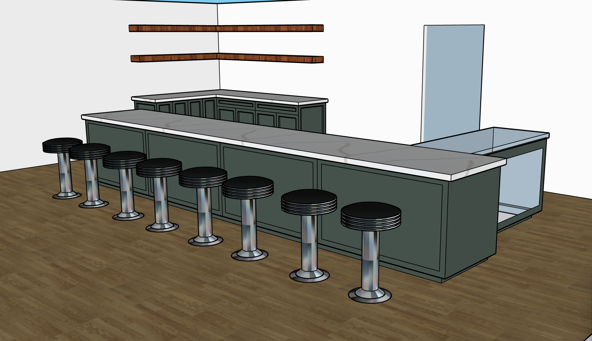 interior shot the peninsula off the long run of cabinets is glass front and glass top the other tops are marble as shown the stools are vintage diner stools with shiny chrome on the body and black leather on the seats