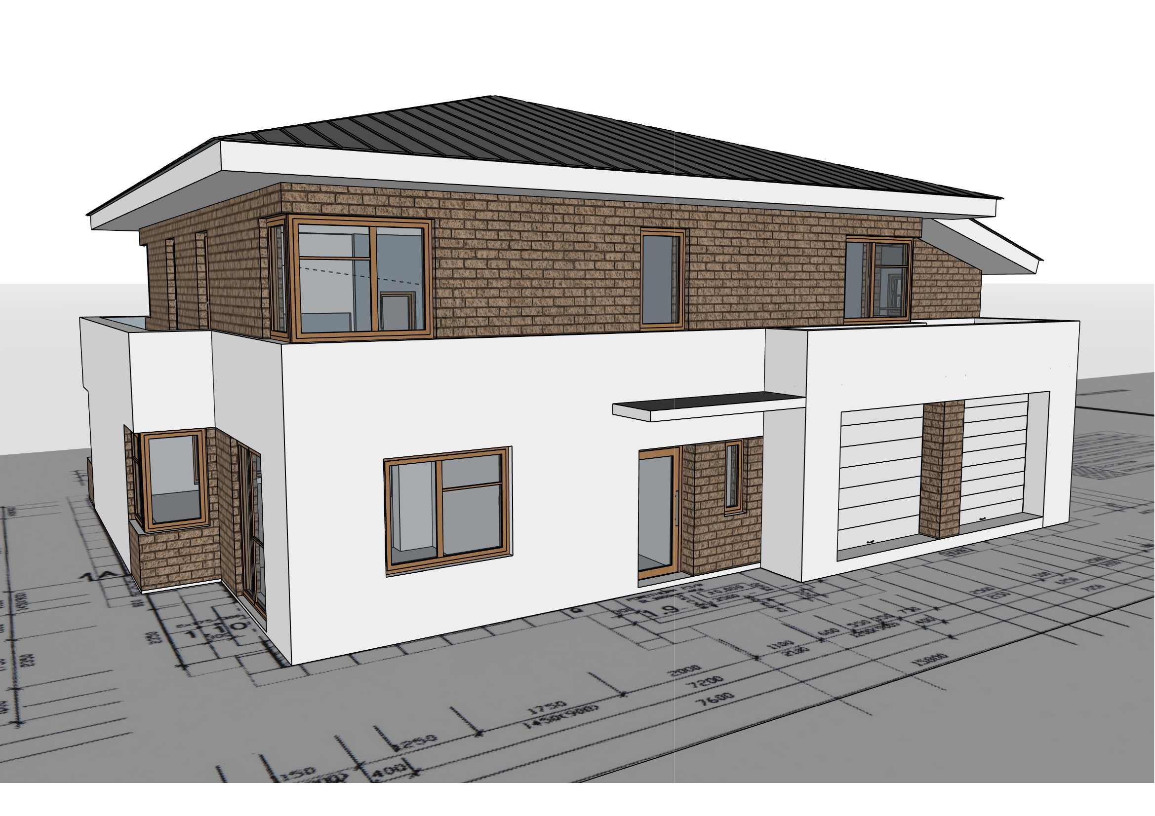 ultra photorealistic architectural visualization based exactly on the provided reference image preserve 100 of the original geometry proportions camera angle perspective field of view building massing and all architectural elements do not modify layout materials placement window positions or structural composition architecture materials modern two story family house with a clean minimalist composition upper floor fa ade warm brown brick cladding slightly textured natural variation realistic joints ground floor fa ade smooth white plaster matte finish subtle imperfections roof dark standing seam metal roofing slightly reflective fine detail window frames natural wood oak tone satin finish garage doors white sectional panels minimalistic subtle horizontal lines entrance canopy flat modern slab dark grey anthracite top surface precise material transitions brick plaster metal lighting setup critical time of day late afternoon golden hour lighting soft warm sunlight from a low angle approx 25 35 long soft shadows with high realism global illumination enabled light bounce from white fa ade onto brick surfaces slight warm color grading cinematic but natural environment ground clean architectural context subtle concrete paving minimal distraction surroundings soft blurred neutral environment no dominant objects sky clear sky with slight warm gradient physically accurate light behavior optional very subtle hdri reflection in windows glass reflections physically correct glass ior 1 52 subtle interior hints no full interior scene needed realistic reflections of sky and surroundings slight dirt imperfection for realism very subtle rendering quality ultra high resolution min 4k ideally 8k physically based rendering pbr workflow ray traced reflections and shadows high micro detail surface imperfections roughness variation no noise no blur artifacts sharp edges clean geometry post processing slight contrast boost soft cinematic tone mapping very subtle vignette no overexposure natural color balance avoid oversaturation strict constraints do not redesign anything do not change materials or colors do not add vegetation people cars unless explicitly requested do not stylize keep strictly photorealistic no artistic interpretation only realism strict geometry lock no interpretation no design enhancement no added objects photorealism priority architectural accuracy enforced