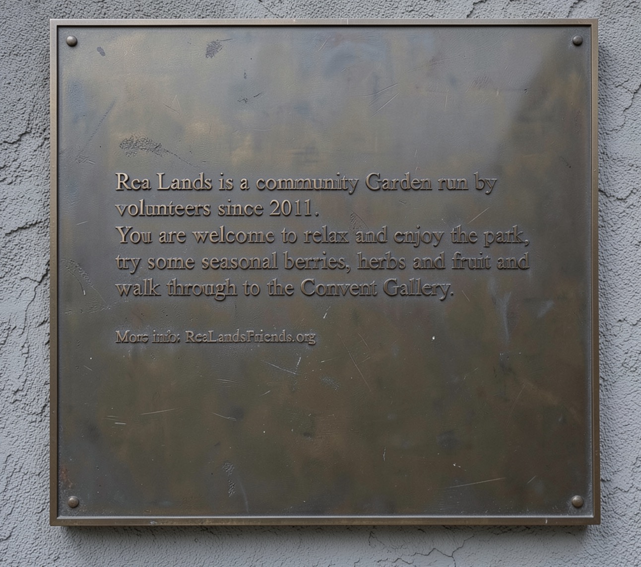 create a cast bronze sign using the text rea lands public park grey stucco wall behind