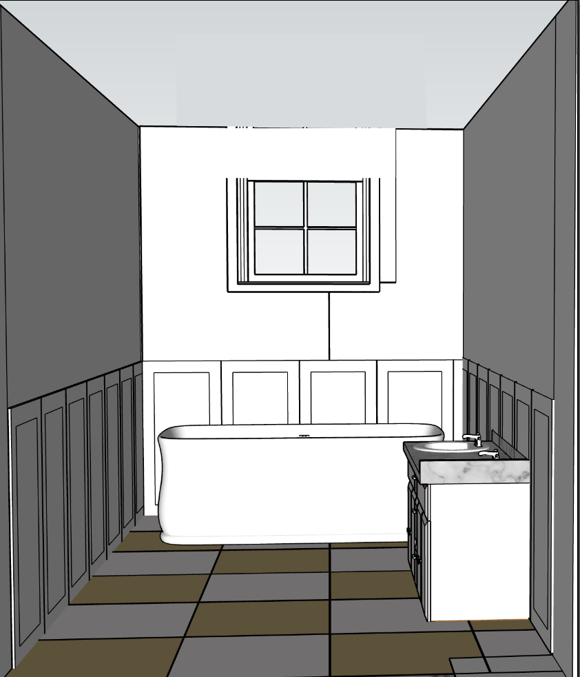 panelling to be a off whote colour pointing by farrow and ball floor to be neutral taps to be brushed gold wall around the window to be flat window moved down vb 10cm marble on the cabinet to be thinner panelling to be neutral yellow bath tap to be centralised walls to be painted in a off white colour cabinet to be painted in a sand colour wuth a marble top cabinet colour to be a lighter sand colour