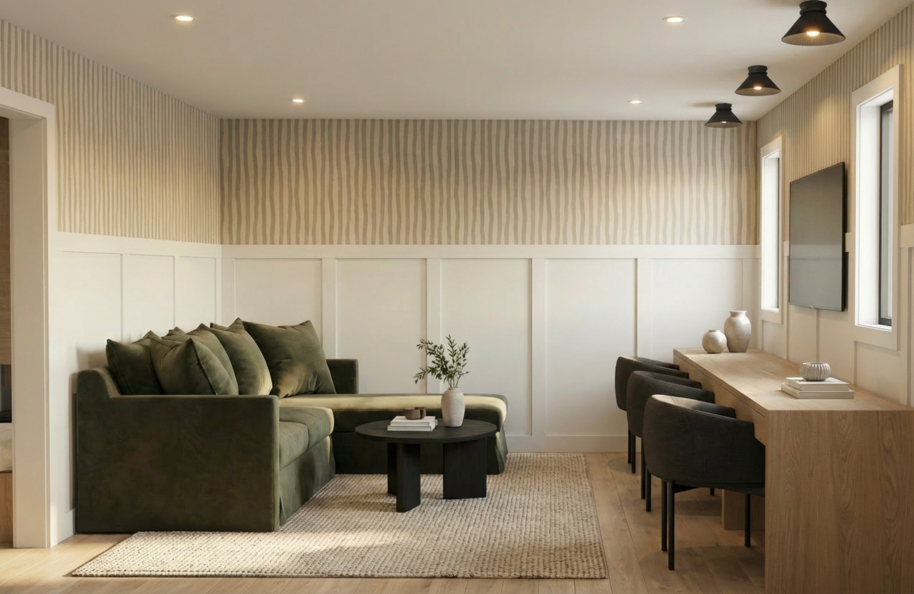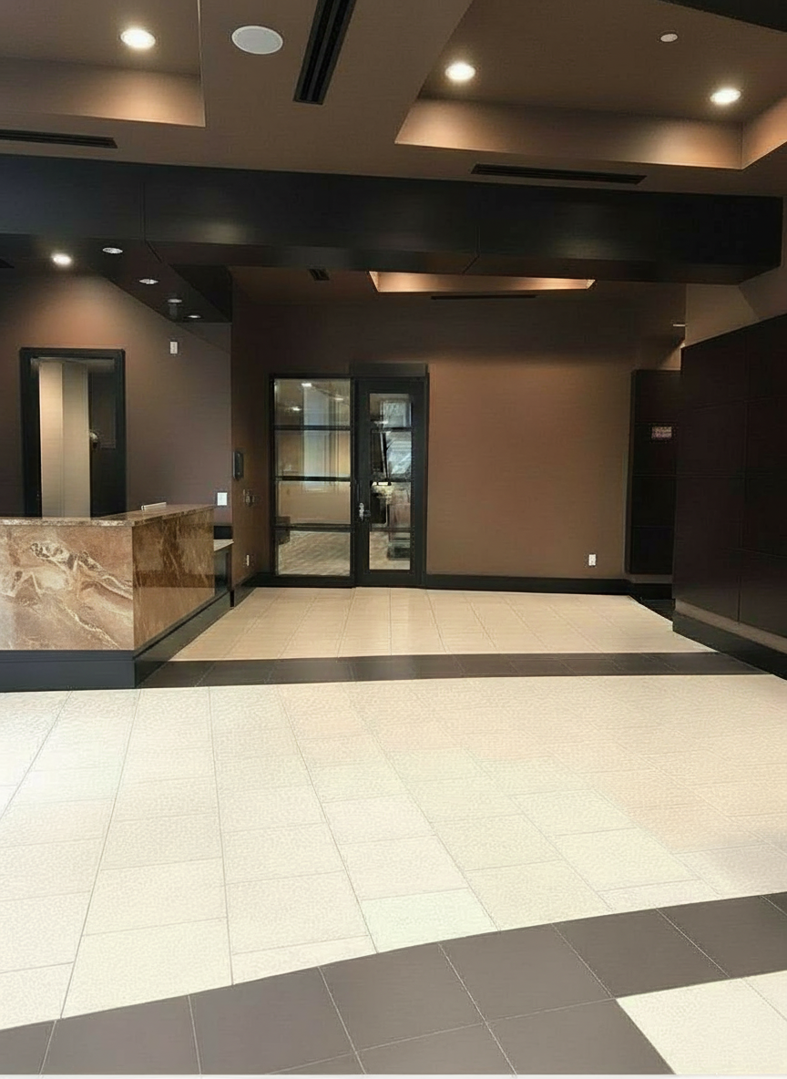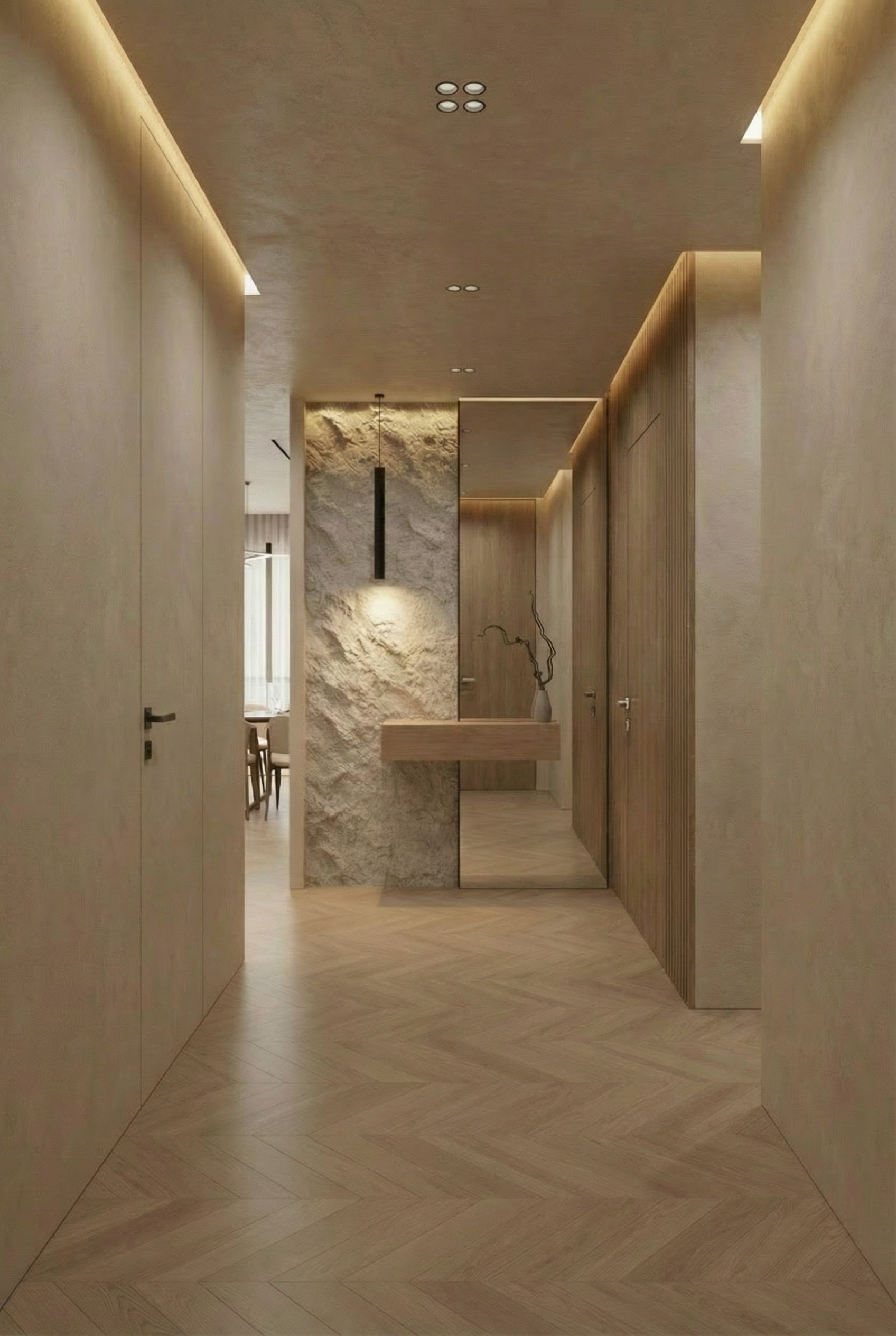 maintain the entire uploaded image exactly as is preserve all geometry architecture camera angle perspective lighting materials reflections and spatial relationships with absolute fidelity do not change anything in the scene except what is explicitly described below only required edit remove the existing lift door on the right wall near the feature wall replace it using the provided reference image only as a guide for the lift door style and form the lift door must be reconstructed in the exact same position scale and alignment as the original the new lift door must have a brushed metal finish critical constraint very important use the reference image only to understand the lift door design style do not copy or infer anything else from the reference image do not match lighting environment materials colors or architectural context from the reference do not transfer any background walls flooring or scene elements from the reference image the reference is strictly for lift door appearance only strict rules do not modify any other part of the image do not change walls floor lighting or camera perspective do not add or redesign any architectural elements only replace the lift door surface design everything else must remain 100 identical to the original upload
