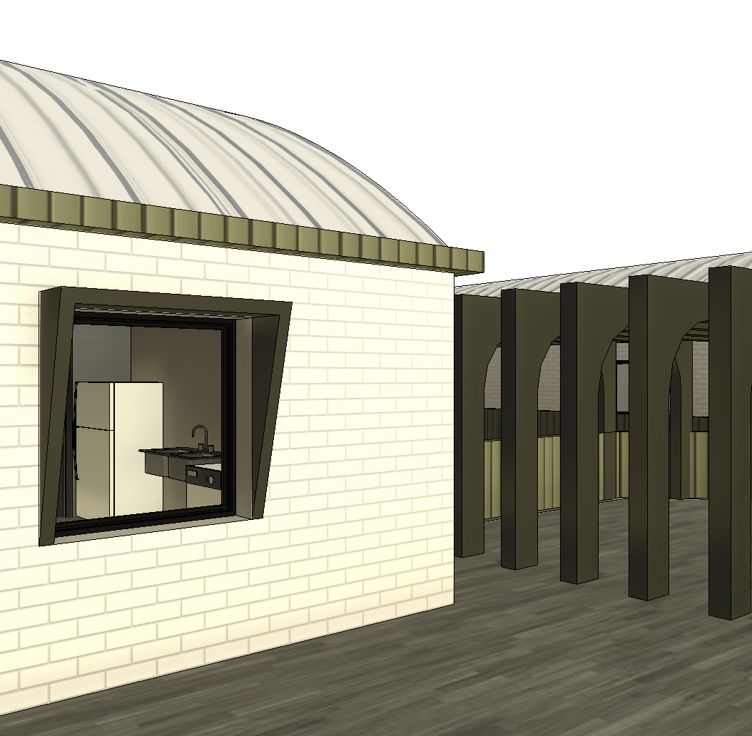 a modern architectural scene depicting a building with a green metallic details rendered with realistic textures the walls are a soft cream brick and the roofs are white corrugated metal the pillars feature a muted olive hue metal material the floor is a warm grey wood flooring