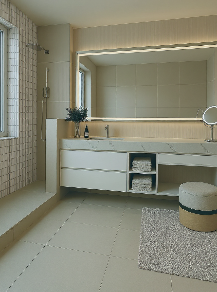 modernist interior shot this is the green tea booth the upper part features a light box with 4000k lighting the lower part consists of contours in multiple shades of light grey on the lower left side of the booth the product is showcased beneath the table the shelf is made of wood and integrates uplighting to highlight the product the circular logo is created using a light box so it also needs to be illuminated the light box should use cooler lighting as the current lighting is too warm architecture