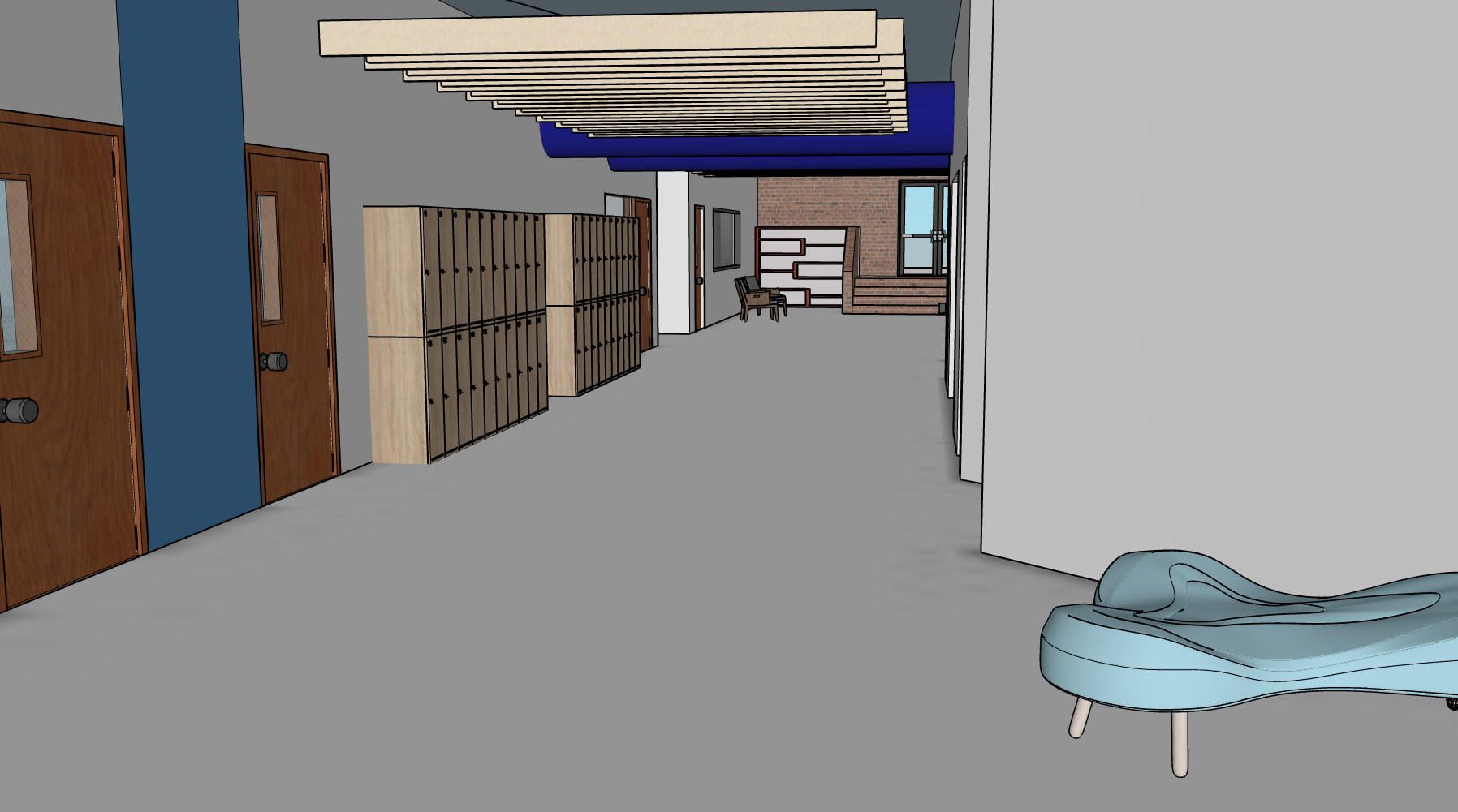 add lights to the entire book shelf add linear lights to the slat wood ceiling add grey carpet tile to the floor