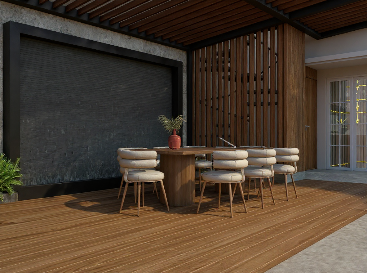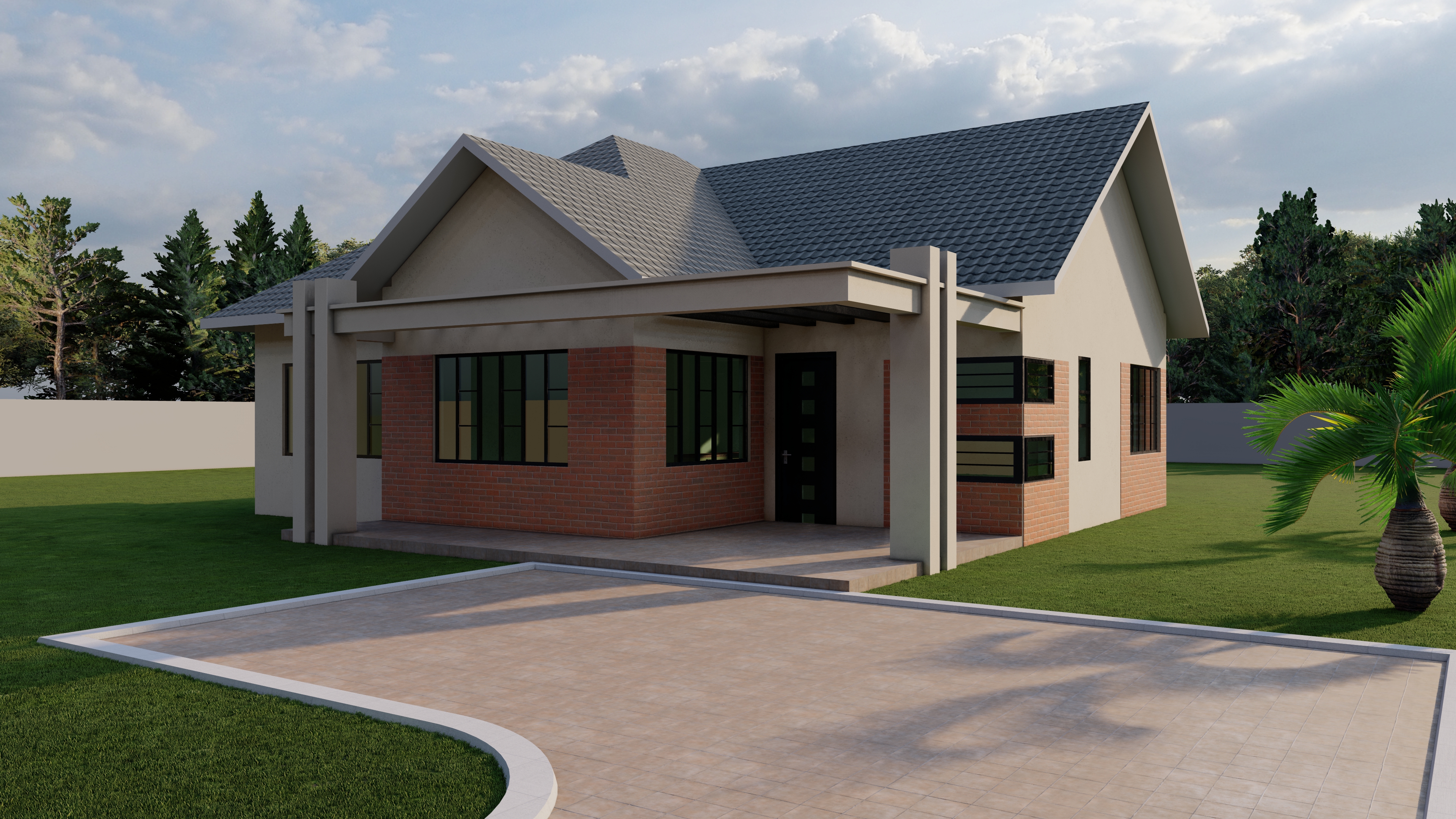 modernist exterior shot sunny suburban setting featuring a modern single story house with a hip roof the roof is slate gray the walls combine warm beige stucco with red brick accents the windows are black framed with clear glass reflecting sunlight the front door is a sleek black with modern design surrounding the house the grass is lush and green complemented by a few palm trees for a tropical feel the driveway and path are laid with light gray stone tiles the sky is partly cloudy with soft diffused sunlight creating a welcoming and peaceful atmosphere architecture