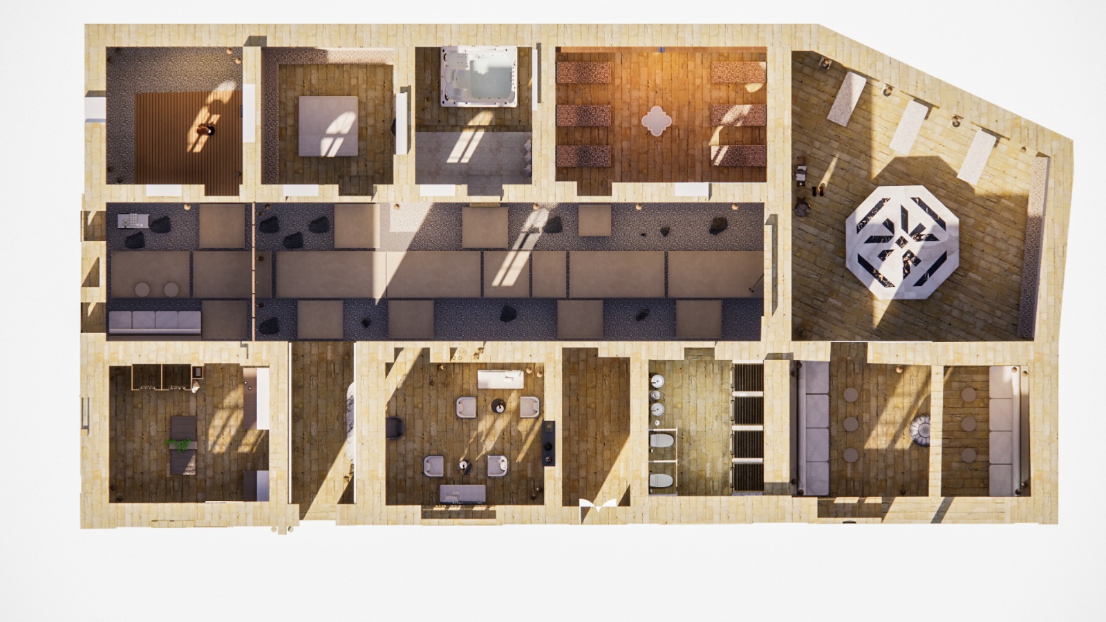 exterior shot please render a section of my 2 floor hammam project with the following details view type orthographic top down section showing both floors in one image lighting style use warm natural lighting with realistic shadows cast at an angle similar to soft sunlight the overall tone should feel earthy and natural materials apply realistic materials stone walls and flooring in warm beige tones wood finishes for floors and some walls as in sauna and steam areas fabric soft textures for furniture water and tile finishes for jacuzzi scrubbing and bathroom areas furniture zoning keep all zones and furniture in their original location do not rearrange or change furniture style or positions cut lines walls cut in the section should appear in dark color or black to clearly show the cut just like in architectural sections zones the hammam includes sauna steam room jacuzzi scrubbing room changing rooms reception bathroom social gathering area majlis with seating tea tables etc realism enhance realism with natural shadows detailed materials and lighting reflections accuracy the section must reflect the exact proportions structure and layout of my sketchup model do not change zones openings furniture or room proportions the walls are made with limestione and in the sauna and scrubbing area white mosaic