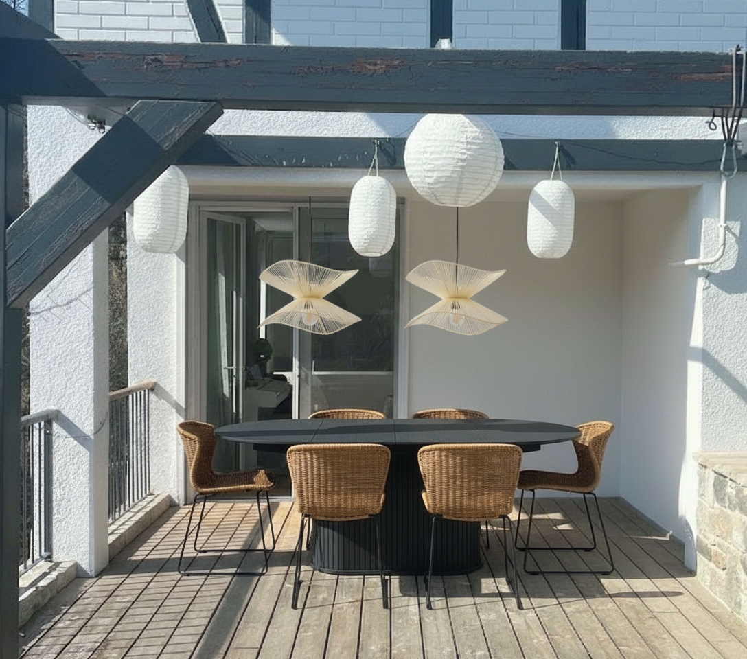 remove white ricepaper lamps move the table and chair closer to backwall and to the right corner