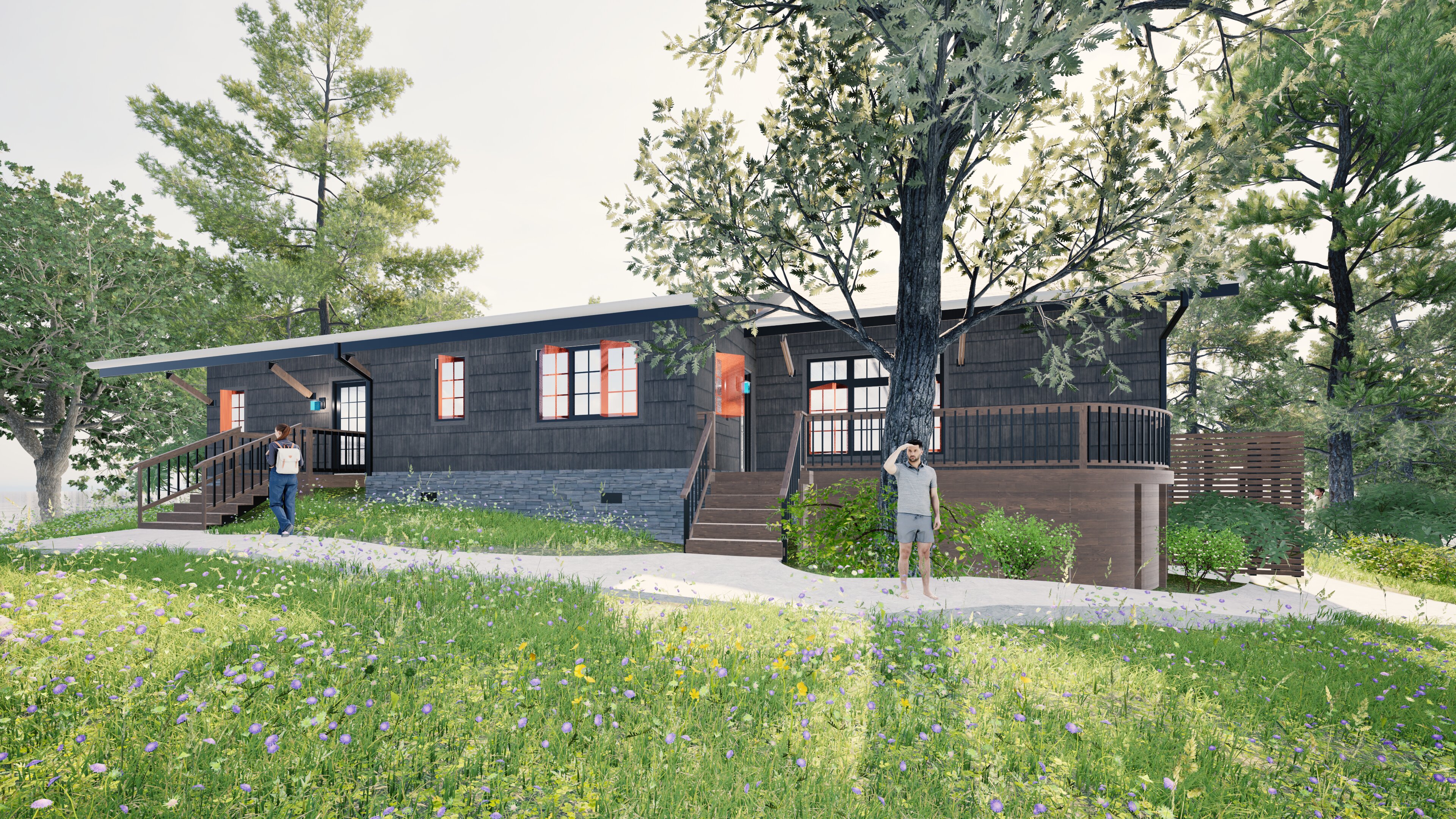 remove red color around windows increase shadows for moodier lighting add clouds to sky image lighting should read as mid morning desaturate colors