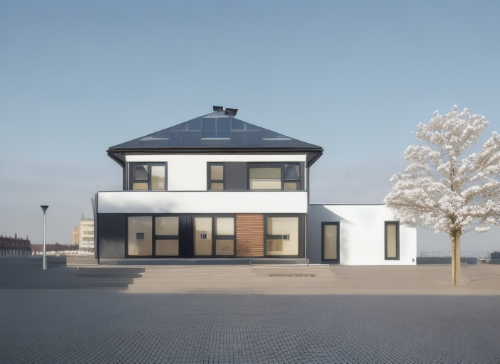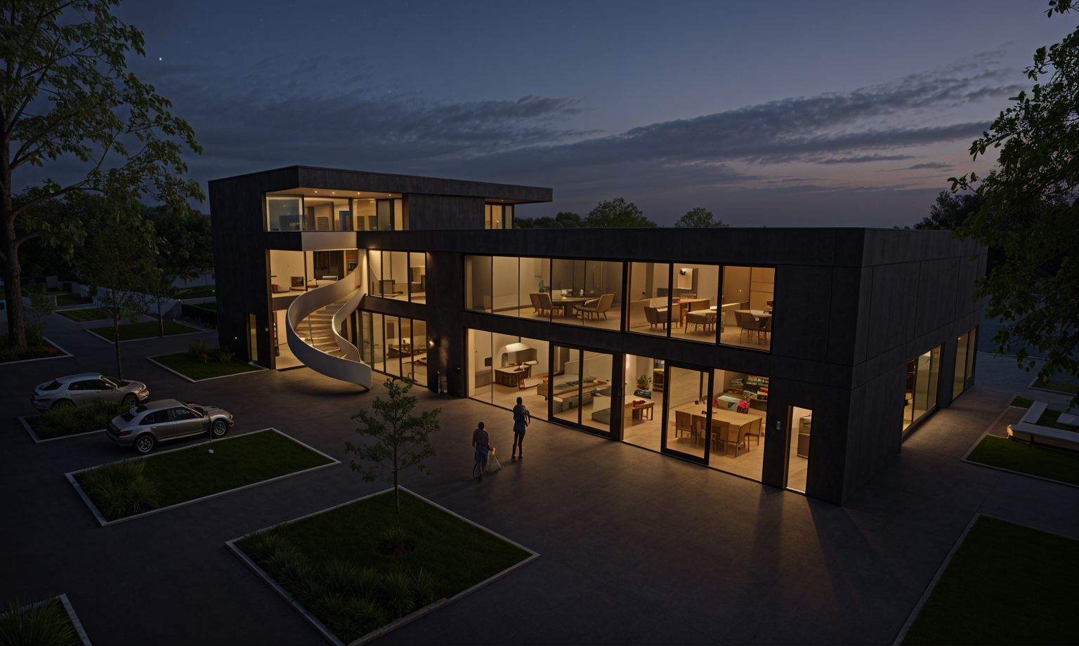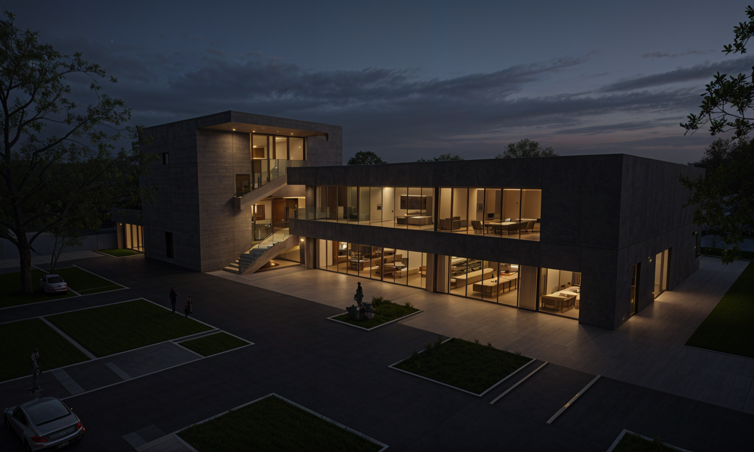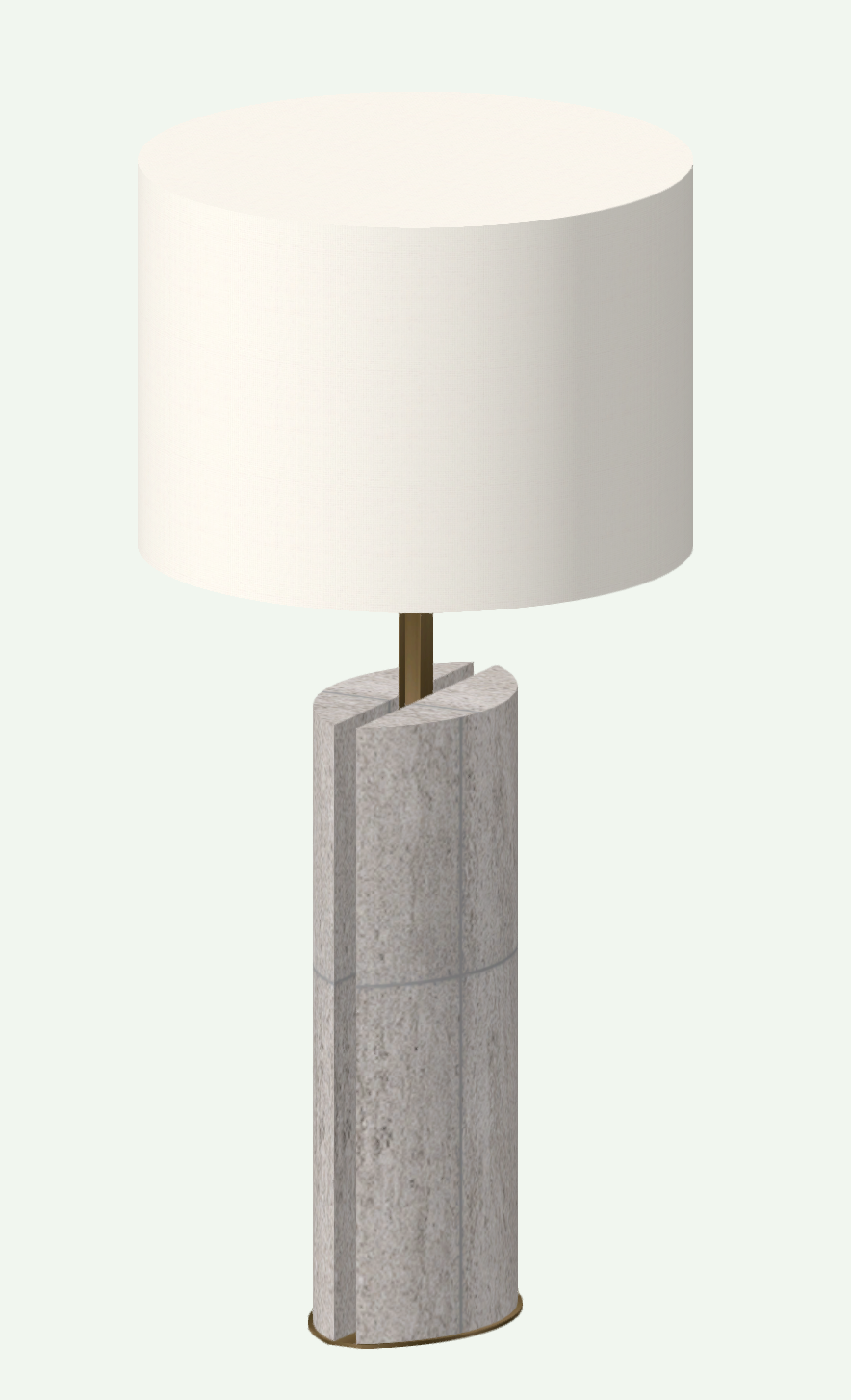 close up shot a realistic rendering of a modern floor lamp in a warm contemporary interior e g a living room with wooden floors and soft lighting the base consists of two half moon shapes made of natural stone showing subtle veining and texture the vertical stand is a brass h profile with gentle metallic reflections the lampshade is made of papier m ch featuring a soft organic texture and a semi translucent look the environment should enhance the materials realistic shadows soft indirect lighting and a neutral background so the lamp remains the focal point
