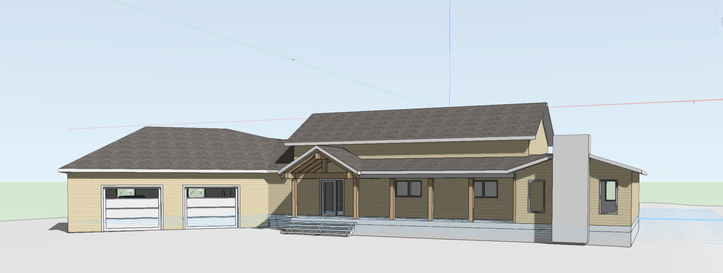 modern farmhouse in grassy landscape with trees gravel driveway to front of building