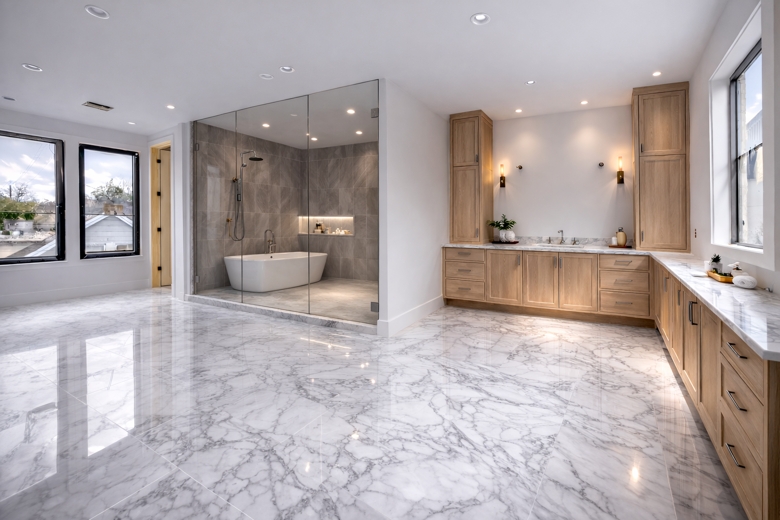 convert this architectural rendering into a highly realistic editorial style luxury real estate photograph suitable for marketing and listing imagery maintain the exact architecture layout geometry window placement and proportions exactly as modeled do not redesign restyle or modify the architecture in any way do not move walls windows cabinetry or structural elements enhance realism only through natural lighting accurate material texture subtle reflections and soft shadow depth the image should feel like a professionally photographed architectural digest style interior used for luxury real estate marketing materials in the space include walls and ceiling painted origami white by sherwin williams the marble flooring should show authentic veining subtle tonal variation and a natural matte sheen walls and ceilings in origami white should appear clean soft and naturally illuminated with balanced daylight and realistic depth natural light should be softly entering through the windows in an editorial photography style creating gentle highlights natural interior bounce light and subtle shadow depth similar to high end architectural photography the final image should appear highly realistic refined and editorial similar to a luxury architectural digest feature or professionally photographed high end listing do not alter architecture layout geometry or materials only enhance realism and staging