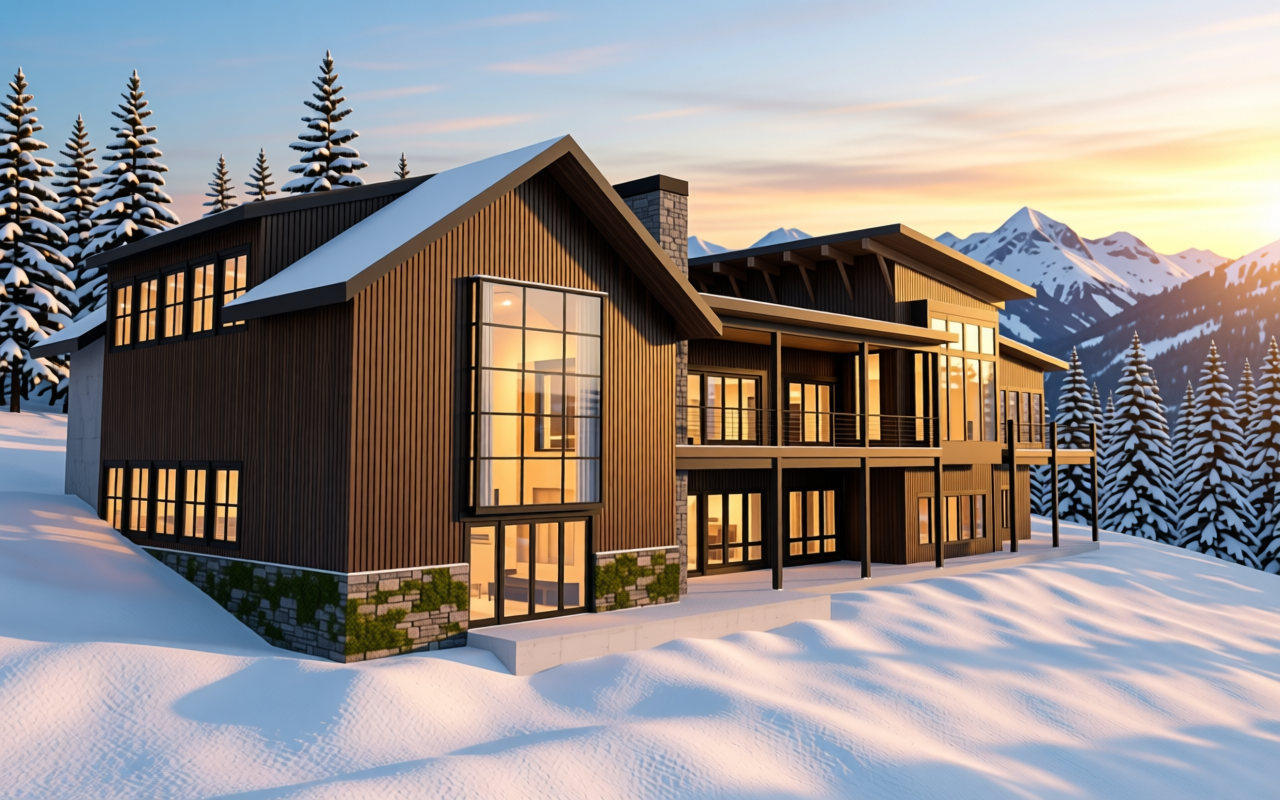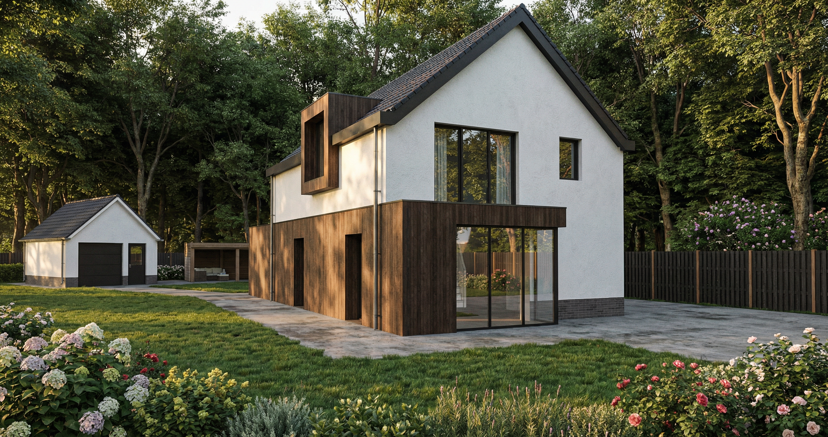 generate hyper realistic visual but with artistic flare of this cad model dont change the view but just make it look real the blue is a balancing pond with wild flower planting the green structrues are native uk trees there is a bus stop right besdie the water then there is a road then the building in the centre of the picture is a comunity building which will be built out for blacl timber and red brickwork with a clock tower and grey slate roof add a bus waiting outside the bus stop the lighter beige colour beside the pool is a bus stop area make the road go past the back of the water feature infront of the building with the clock tower