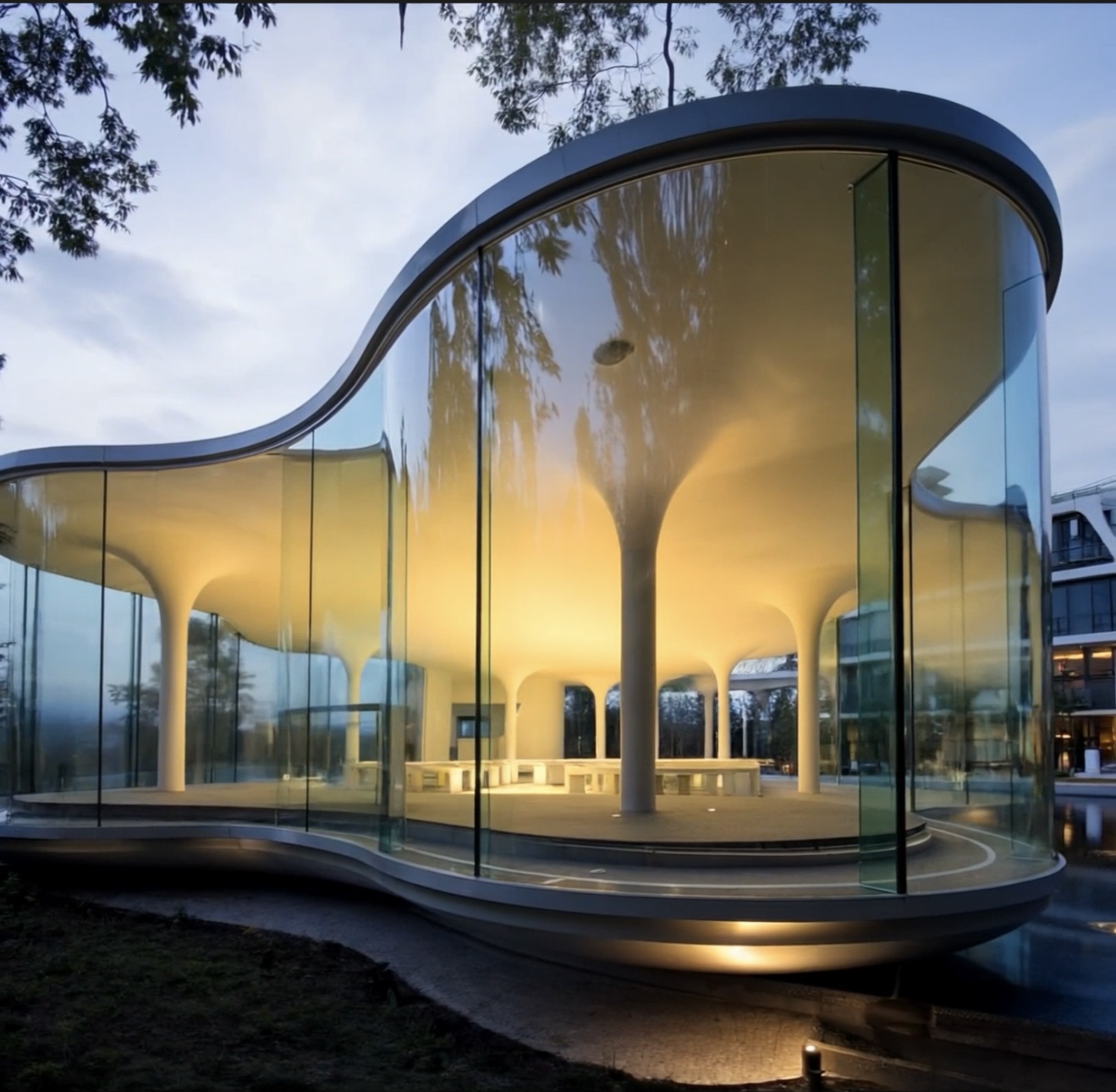 exterior shot ice cream store capture a modern architectural marvel featuring a building with curved glass walls and smooth organic shapes the structure is illuminated warmly casting a soft golden glow against the twilight sky the glass reflects serene blue tones from the adjacent water surround this beautiful scene with lush greenery hinting at a tranquil atmosphere add subtle lighting along the perimeter to enhance the elegant and futuristic design architecture