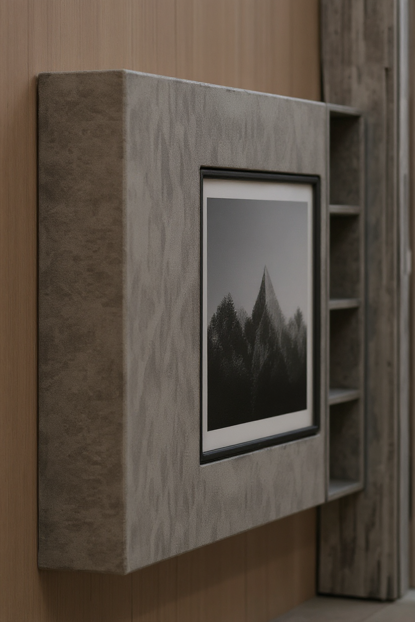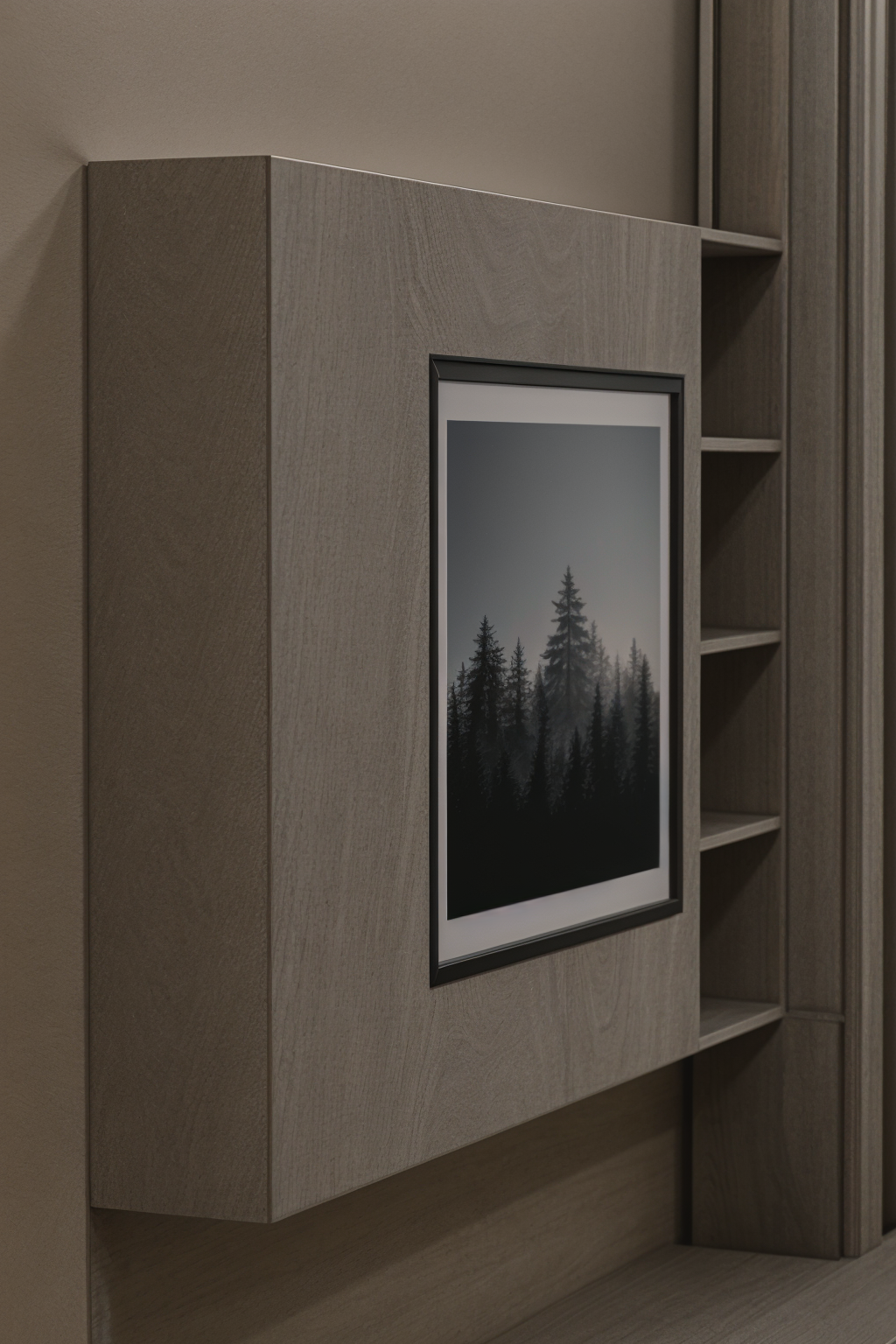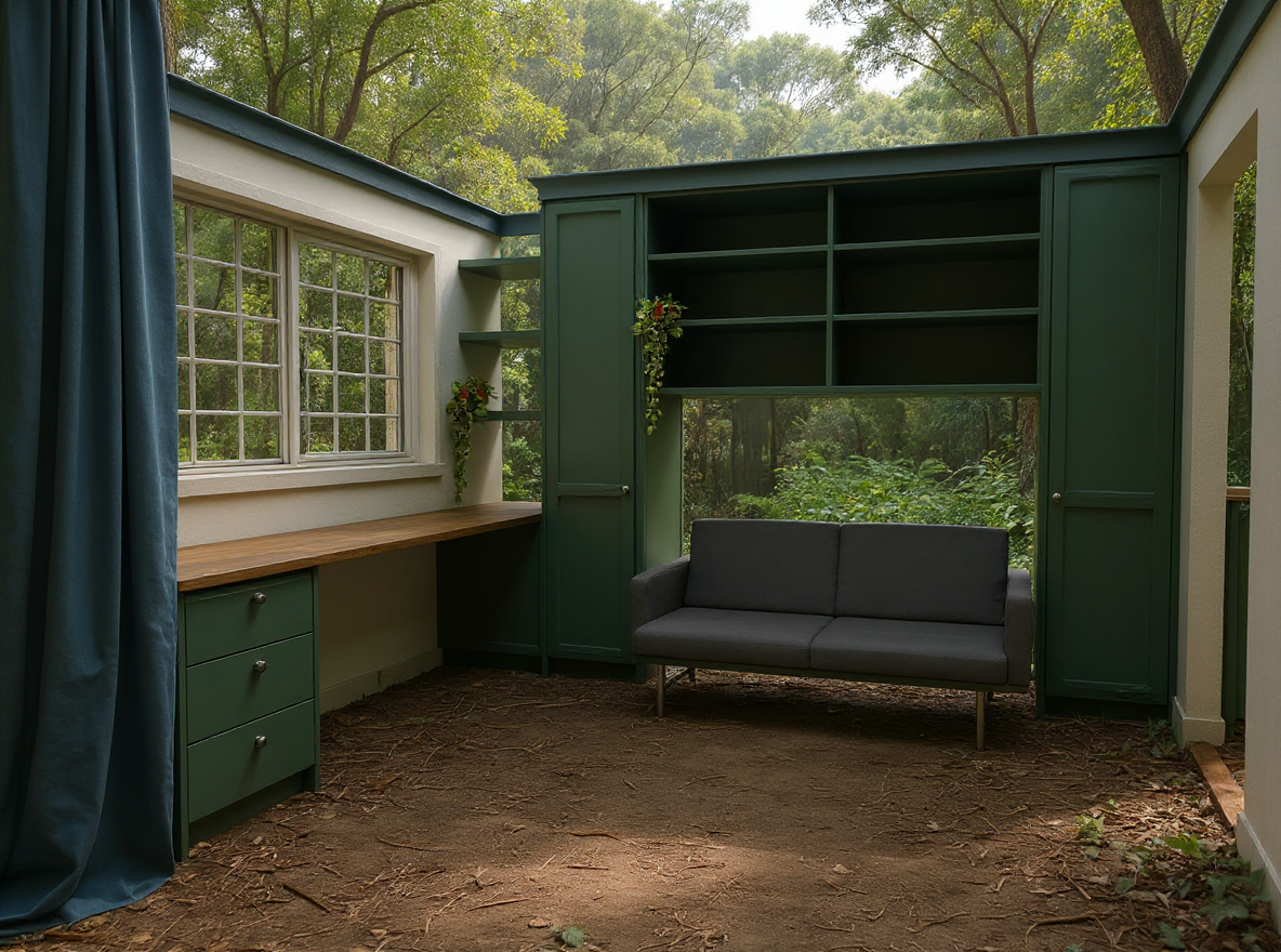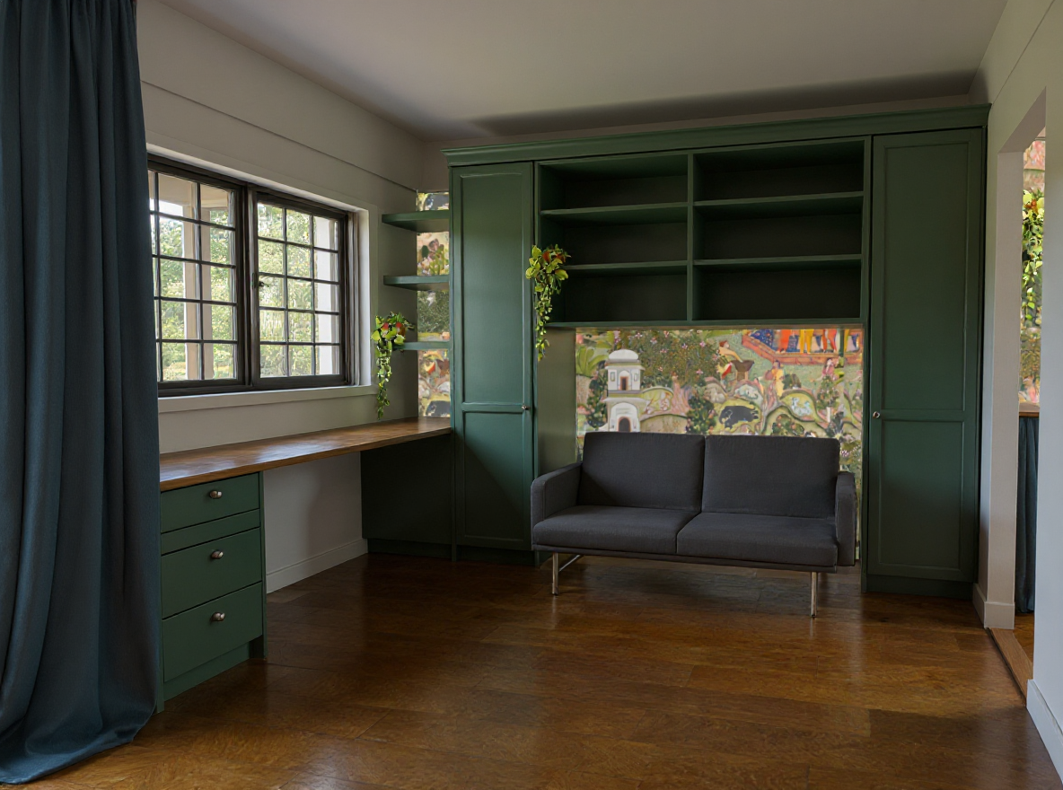 render highest quality photorealism and textures wallpaper to be maintained ceiling painted to match cabinets walls to be white lit by downlights