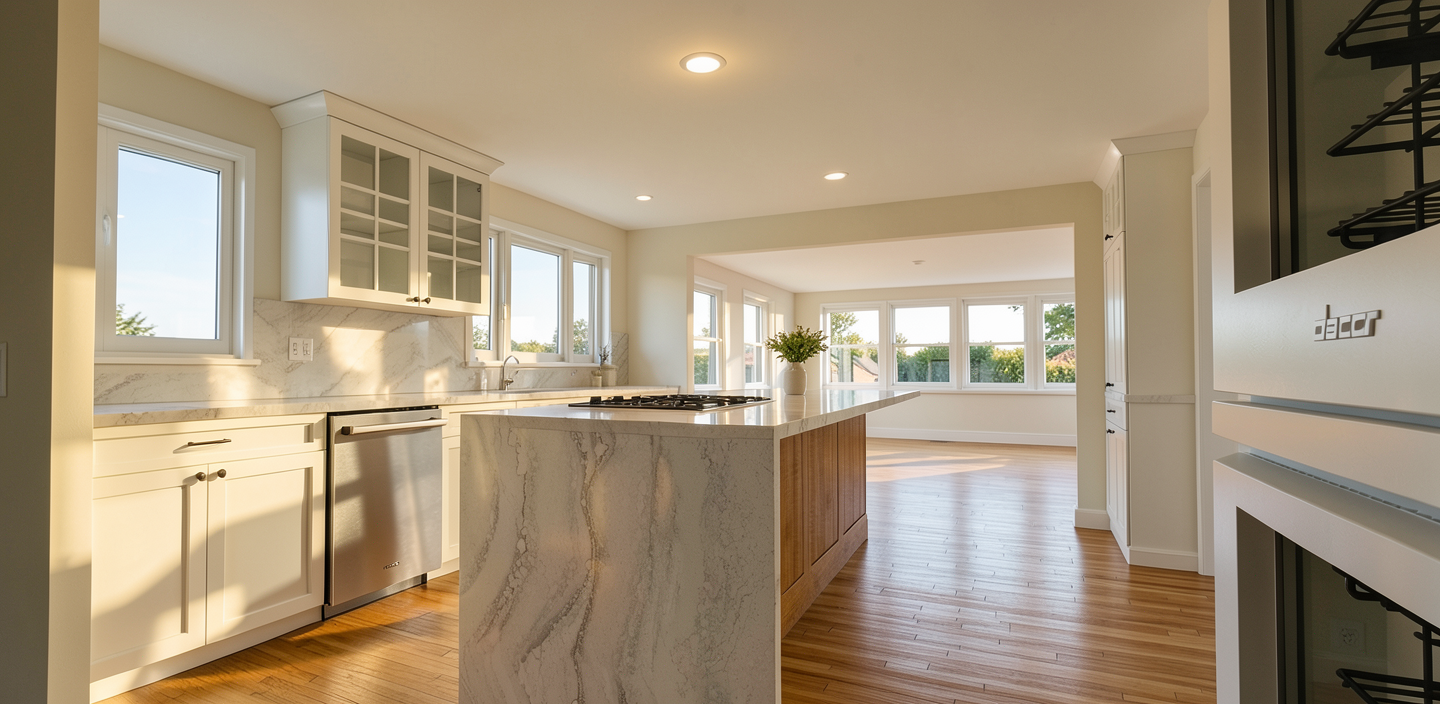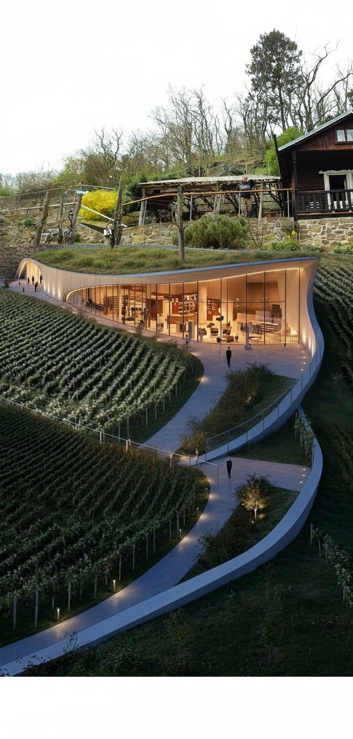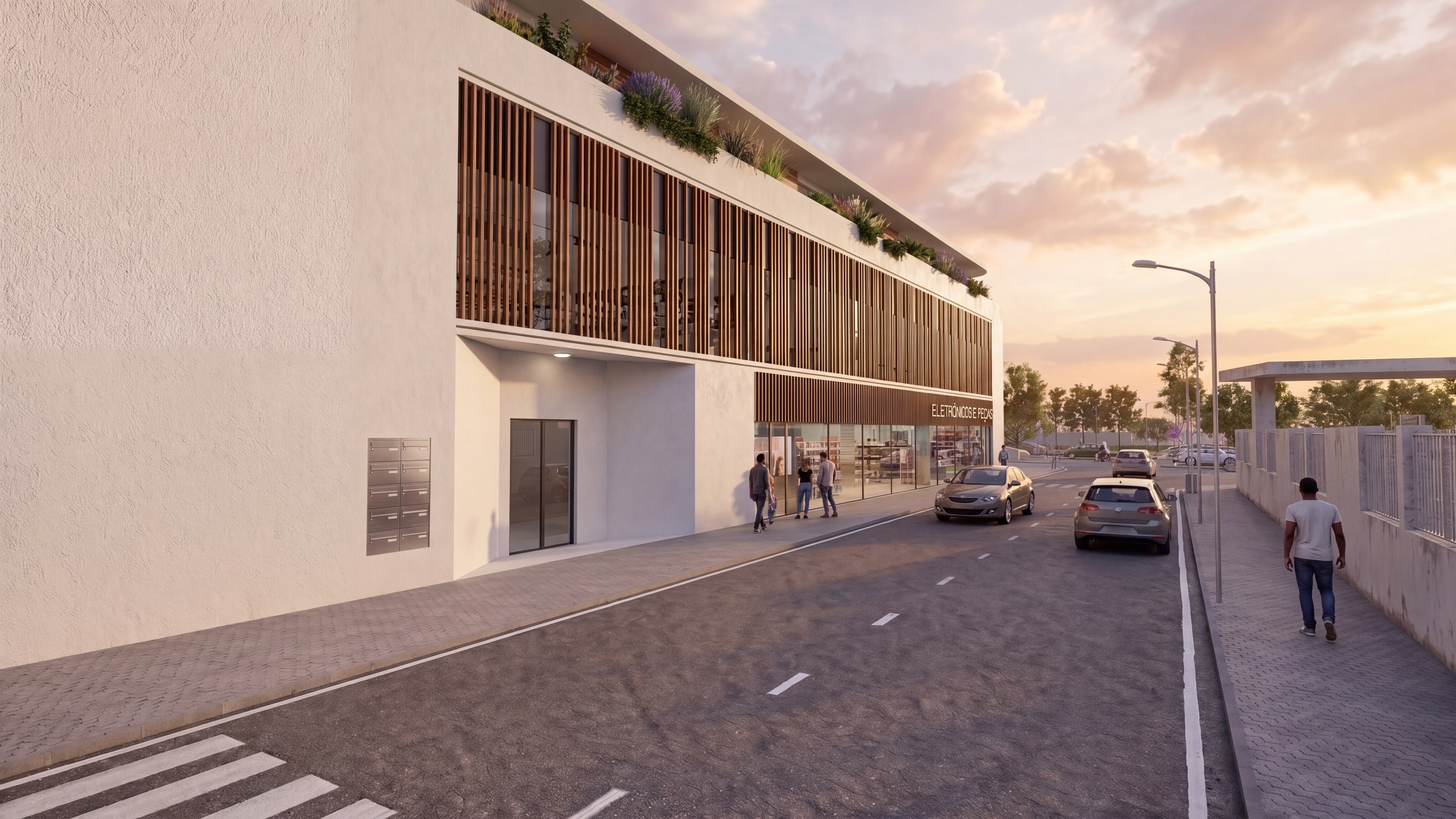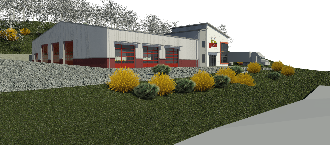 render a beautifully detailed industrial building set in a natural environment the building features a modern white facade with red accents on doors and windows surround the building with rich greenery incorporating lush dark green shrubs alongside vibrant yellow bushes the sky is clear with soft sunlight casting gentle shadows creating a peaceful atmosphere the ground is covered with a mixture of dark green grass and grey gravel in the background include dense leafy trees in shades of green to add depth and contrast to the scene dark gray roof and canopies over some garage doors and entry door semi delivery truck on the far side of the building