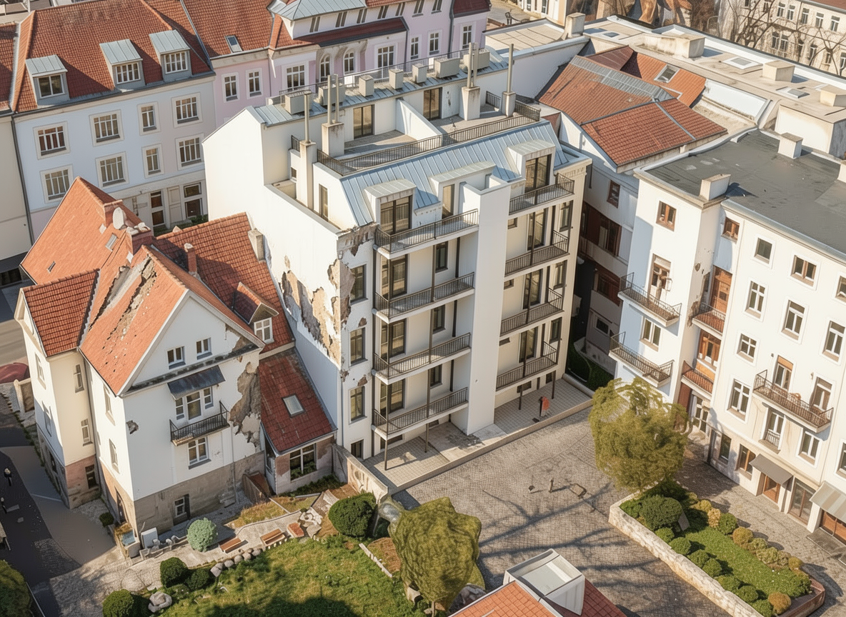 create a photorealistic view do not change the shape of the buildings do not add any inscriptions do not change the inscriptions of numbers and registration plates