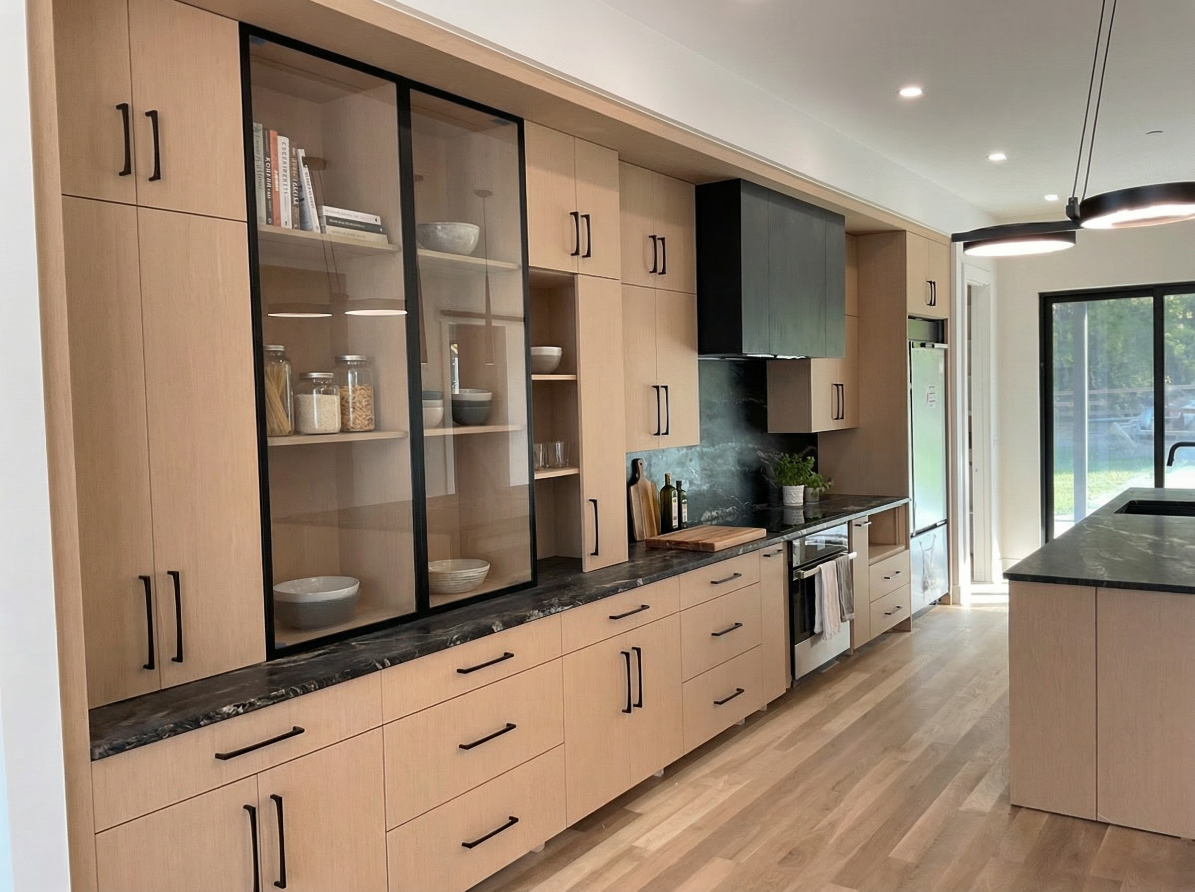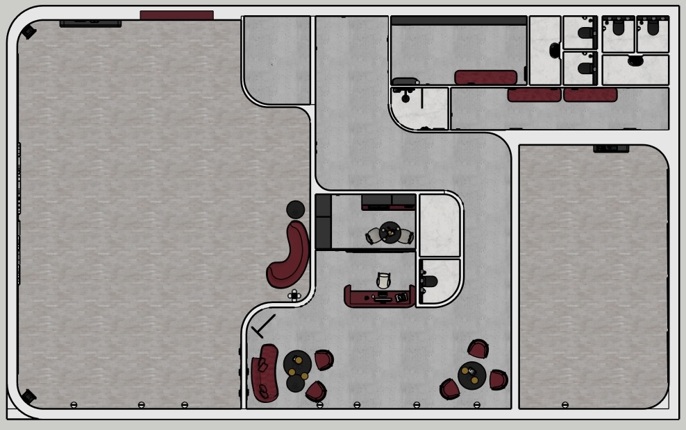 a sleek modern interior design of a studio space the furniture includes deep burgundy chairs and sofas in room on the left the dance room is grey wood floor burgundy sofa and small black table on the wall are sconces up on the right side is small room with smooth concrete floor the hallway has also concrete on the floor the room on the middle the reception has deep burgundy chairs and sofa there is matte burgundy reception desk up is small room with table and two chairs on the right side is small dance room with grey wood floor up are two changing rooms with deep burgundy sittings and concrete floor there are also wc with marble floors there is grey wood floor smooth concrete and marble tiles the space should exude a polished and contemporary feel with sharp black lines accentuating the architecture include subtle shadows and highlights to create depth enhancing the luxurious ambiance in this modern setting