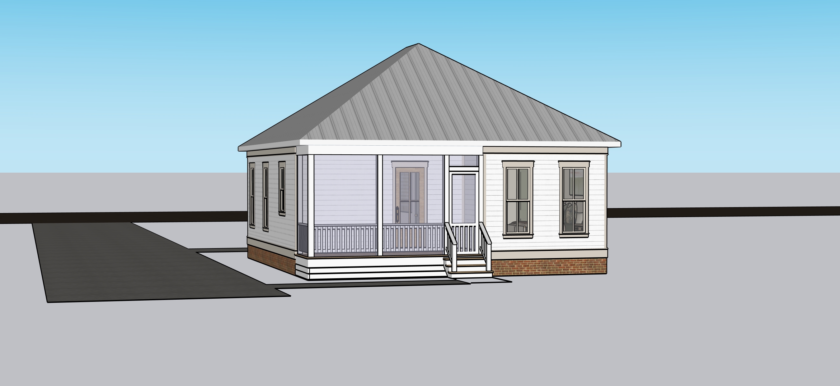 maintain colors and design add landscaping country setting with wooded background maintain driveway and sidewalk design add road running left to right behind the house that the driveway connects to