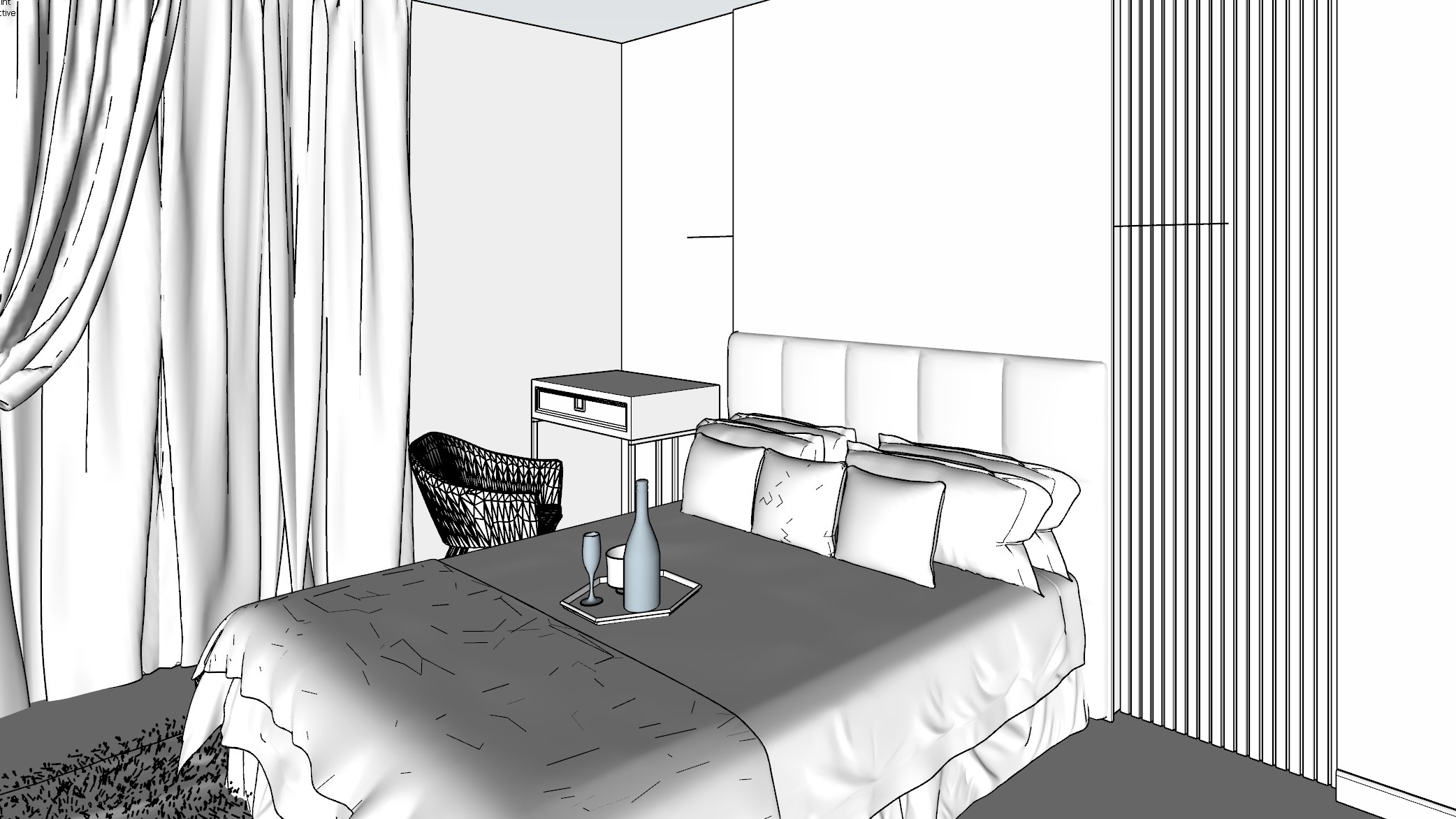 exterior shot create a photorealistic rendering of a bedroom in a modern classic style it should be elegant cozy and stylish