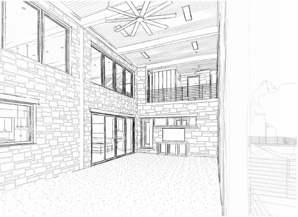 turn this exterior back porch sketch into an image that reflects a modern contemporary style with strong influences of scandinavian minimalism and industrial modernism blended with organic biophilic elements here s a breakdown of the architectural characteristics 1 modern contemporary architecture clean lines and open plan layout double height ceilings creating vertical drama and spaciousness large expanses of floor to ceiling glass that blur the boundary between indoors and outdoors minimal ornamentation with emphasis on form and material 2 scandinavian influence warm natural materials especially the light toned wood ceiling neutral color palette beige taupe warm gray functional simple furniture with soft textures emphasis on natural light and coziness a hygge quality 3 industrial modern elements exposed concrete feature wall black steel window framing matte black pendant lighting clean lined kitchen cabinetry with dark finishes 4 organic biophilic touches live edge wood coffee table indoor plants integrated into the design strong visual connection to the surrounding forest landscape 5 material palette concrete warm wood black metal natural textiles woven rug linen sofa stone or engineered surfaces in the kitchen overall this space could be described as modern organic contemporary with scandinavian and industrial influences it s sophisticated yet warm balancing minimalism with texture and natural materials