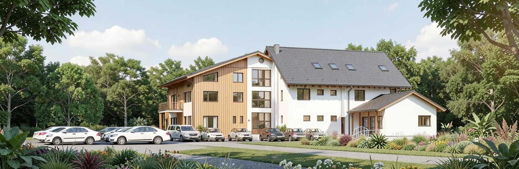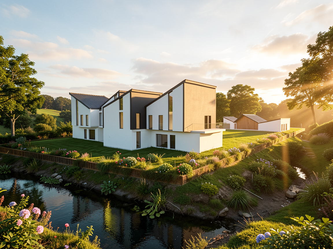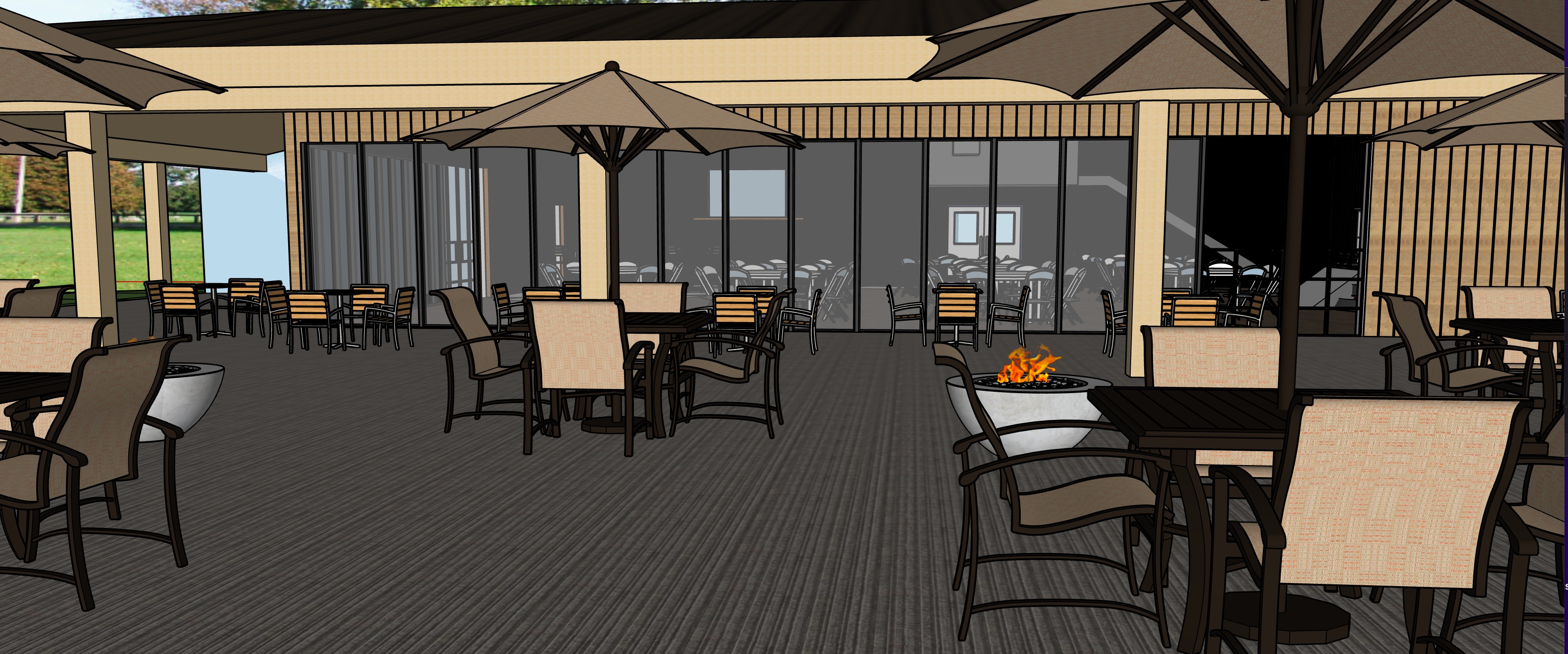 a modern sleek house perched on a grassy hillside the exterior features dark gray siding and warm wooden paneling for a contemporary look large floor to ceiling glass windows reflect a clear blue sky letting in ample sunlight the surrounding grass is a rich vibrant green creating a fresh and natural setting the atmosphere is calm and serene evoking a sense of peaceful modern living add family s with kids siting at the tables walking around playing make the grass into concrete patio