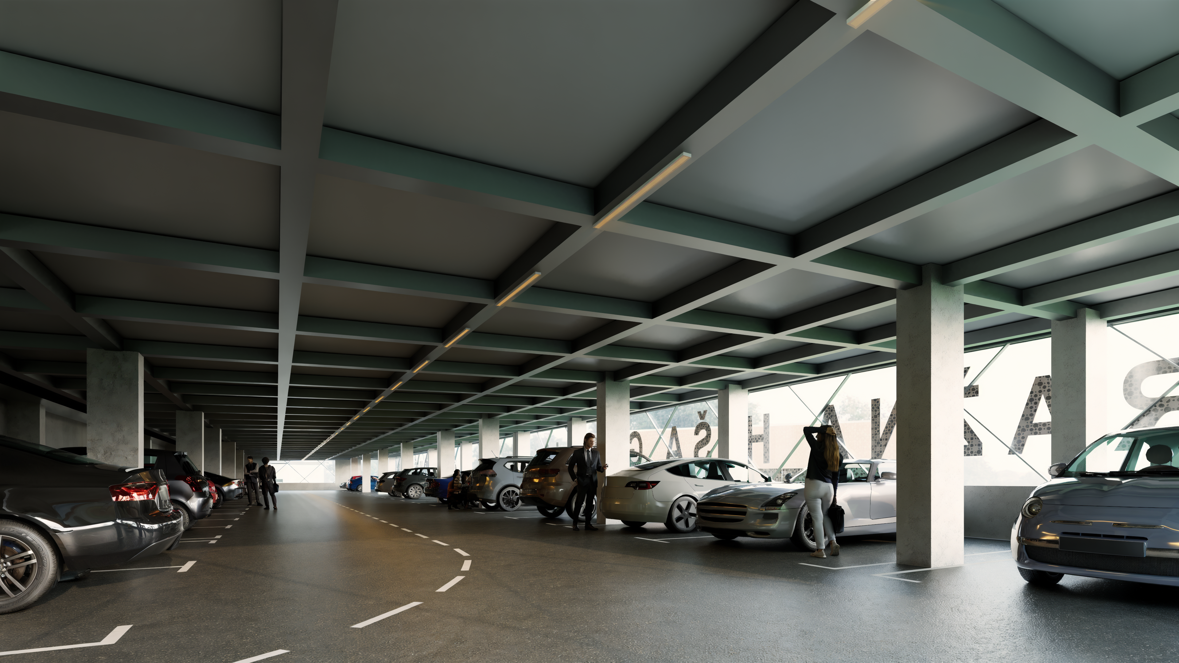 no greeen colour on the beams walls or the ceiling cosy bright atmosphere surrounding objects and trees can be seen through the perforated fascade vehicle registration plates must be seen on the cars