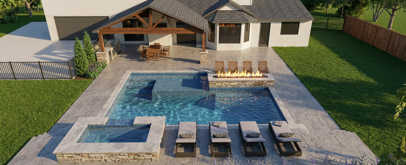 create a high res real photo with spring setting green grass full colorful bushes and plants with blue sky make look new board batten siding alabaster country white color siding and porch details new charcoal architectural roofing 16 9 ratio window frames mat black all doors matt black add a 2 car garage on far right side show asphalt driveway to the garage doors garage door color may black