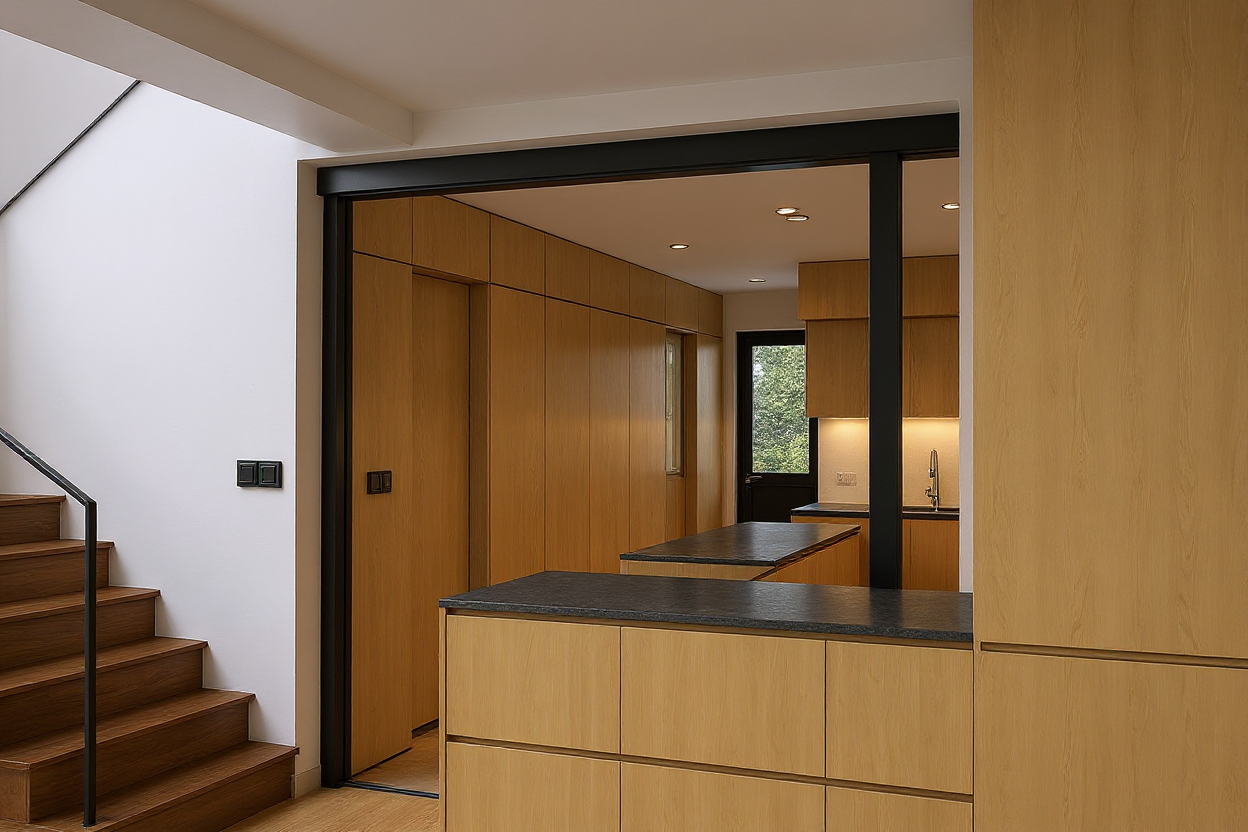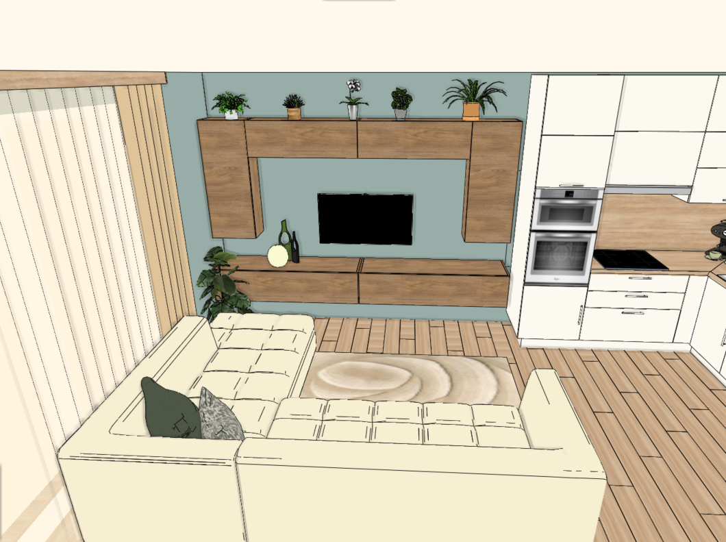interior shot please create a soft light scandinavian atmosphere the kitchen is matte white the countertop and backsplash are natural oak the floor is also natural oak the wall is rosemary branch color blue green the curtains are white the blackout is beige from floor to ceiling the sofa is beige the entire tv cabinet on the wall is uniformly medium oak with closed doors the cabinet reaches from the wall to the kitchen leave the pattern of the carpet as shown in the picture