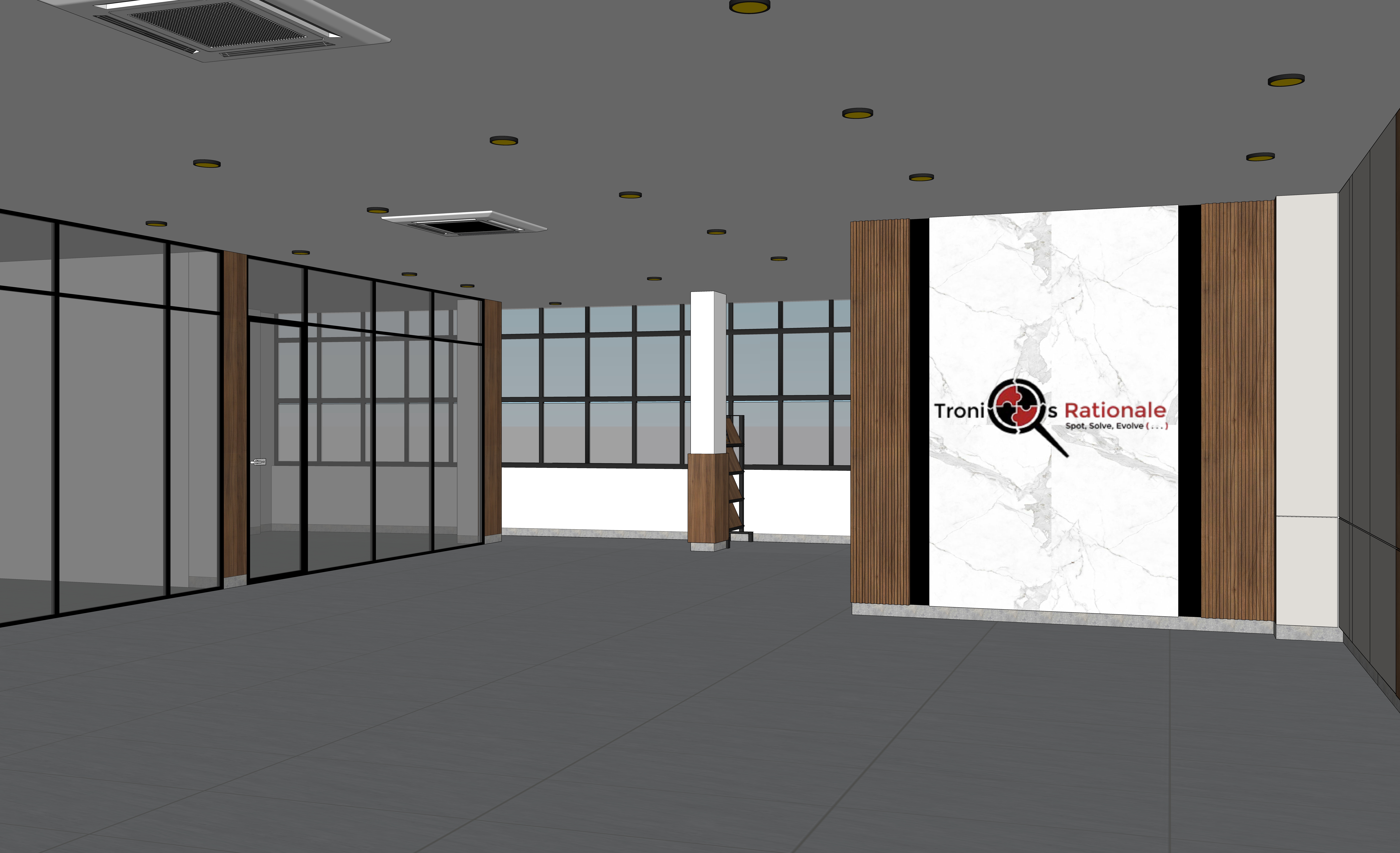 render a modern office interior with a sleek and professional atmosphere the ceiling is a muted charcoal gray with recessed lighting that casts a warm glow incorporate full height glass walls with thin black frames giving an open and spacious feel the flooring is a dark slate gray complementing the ceiling the central feature wall showcases a luxurious white marble panel with subtle gray veining flanked by rich wooden textures in a mid tone brown shade soft natural light filters through large windows enhancing the space with a calm and inviting ambiance