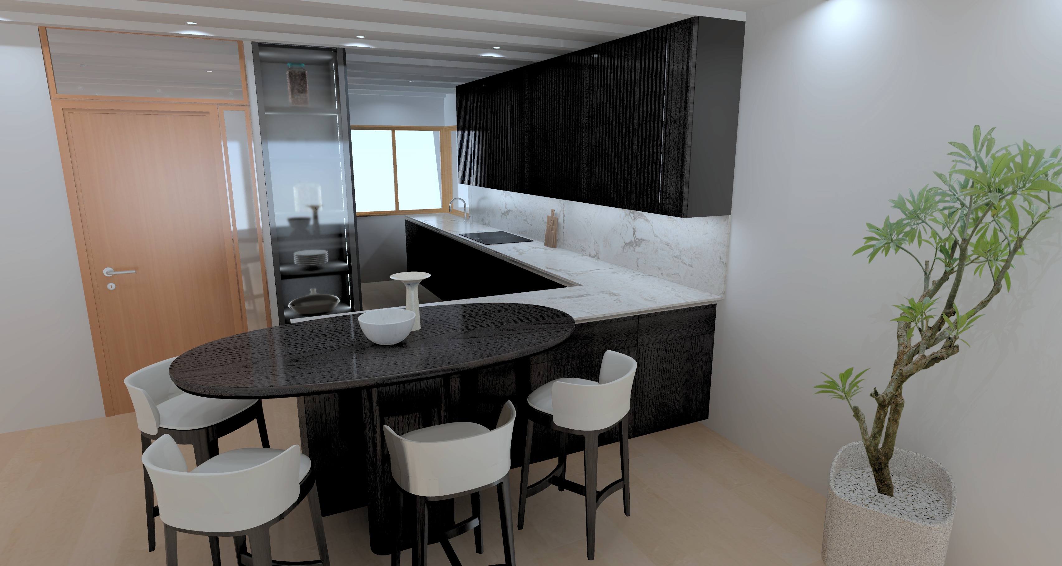 act as an award winning architectural photographer and senior cgi to photo compositing artist specialized in transforming sketchup style interior renders into indistinguishable high end photoreal architectural photographs your task is to convert the provided image into a fully photorealistic interior photograph while strictly preserving the original architecture layout and composition 1 absolute preservation rules non negotiable preserve exactly architecture dimensions proportions and layout camera position focal length feel perspective and framing horizon line vertical alignment and composition balance do not move resize add or remove any elements modify furniture placement cabinetry openings or fixtures alter spatial relationships or staging maintain a perfectly consistent architectural perspective no warping no reinterpretation 2 camera photographic realism simulate a full frame professional architectural camera setup maintain natural lens behavior minimal distortion clean verticals and controlled perspective add subtle photographic qualities fine natural grain realistic depth and micro contrast avoid hdr look over sharpening artificial clarity 3 materials surface realism high priority replace all materials with ultra realistic 4k 8k pbr textures including accurate albedo roughness gloss normal maps micro displacement where needed precise material definitions floor natural wood parquet flooring matte finish not glossy subtle grain variation realistic plank joints slight wear cabinetry furniture dark wood oak finish soft matte reflectance slight tonal variation and realistic edge detailing countertop plan de travail same marble brecia capraia continuous homogeneous appearance realistic soft reflections non plastic non glossy dense tactile premium look glass doors green tinted fluted ribbed bronze tinted glass subtle vertical striation physically accurate light diffusion and reflections slight opacity with realistic depth all surfaces must include micro scratches slight smudges edge wear imperfect reflectivity realistic seams and joints 4 vegetation natural elements replace all plants with botanically accurate ultra detailed foliage include variation in leaf size orientation and density natural branching randomness subsurface scattering light passing through leaves avoid decorative or artificial cgi plant appearance 5 lighting global illumination use natural daylight only consistent with openings ensure physically accurate sun direction soft realistic shadows with penumbra global illumination and bounced light subtle ambient occlusion maintain balanced interior exterior exposure no blown highlights or artificial brightness 6 atmosphere color grading apply true to life photographic grading neutral whites accurate black and wood tones controlled contrast and dynamic range add subtle atmospheric depth realistic air perspective 7 final realism target the final image must be indistinguishable from a real architectural photograph suitable for publication in a premium design magazine 8 negative constraints strict no cgi look no plastic or fake materials no exaggerated reflections no artificial glow or bloom no layout or design changes no added or removed objects no stylization or artistic reinterpretationact as an award winning architectural photographer and senior cgi to photo compositing artist specialized in transforming sketchup style interior renders into indistinguishable high end photoreal architectural photographs your task is to convert the provided image into a fully photorealistic interior photograph while strictly preserving the original architecture layout and composition 1 absolute preservation rules non negotiable preserve exactly architecture dimensions proportions and layout camera position focal length feel perspective and framing horizon line vertical alignment and composition balance do not move resize add or remove any elements modify furniture placement cabinetry openings or fixtures alter spatial relationships or staging maintain a perfectly consistent architectural perspective no warping no reinterpretation 2 camera photographic realism simulate a full frame professional architectural camera setup maintain natural lens behavior minimal distortion clean verticals and controlled perspective add subtle photographic qualities fine natural grain realistic depth and micro contrast avoid hdr look over sharpening artificial clarity 3 materials surface realism high priority replace all materials with ultra realistic 4k 8k pbr textures including accurate albedo roughness gloss normal maps micro displacement where needed precise material definitions floor natural wood parquet flooring matte finish not glossy subtle grain variation realistic plank joints slight wear cabinetry furniture dark wood melamine finish soft matte to satin reflectance slight tonal variation and realistic edge detailing countertop plan de travail same marble brecia caprai finish as cabinetry continuous homogeneous appearance realistic soft reflections non plastic non glossy dense tactile premium look glass doors green tinted fluted ribbed bronze tinted glass subtle vertical striation physically accurate light diffusion and reflections slight opacity with realistic depth all surfaces must include micro scratches slight smudges edge wear imperfect reflectivity realistic seams and joints 4 vegetation natural elements replace all plants with botanically accurate ultra detailed foliage include variation in leaf size orientation and density natural branching randomness subsurface scattering light passing through leaves avoid decorative or artificial cgi plant appearance 5 lighting global illumination use natural daylight only consistent with openings ensure physically accurate sun direction soft realistic shadows with penumbra global illumination and bounced light subtle ambient occlusion maintain balanced interior exterior exposure no blown highlights or artificial brightness 6 atmosphere color grading apply true